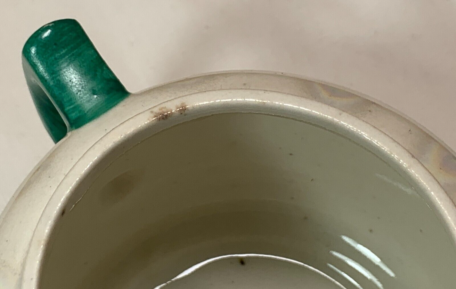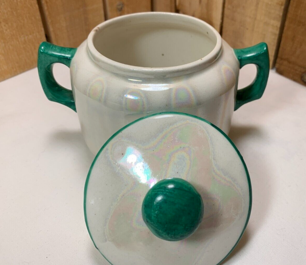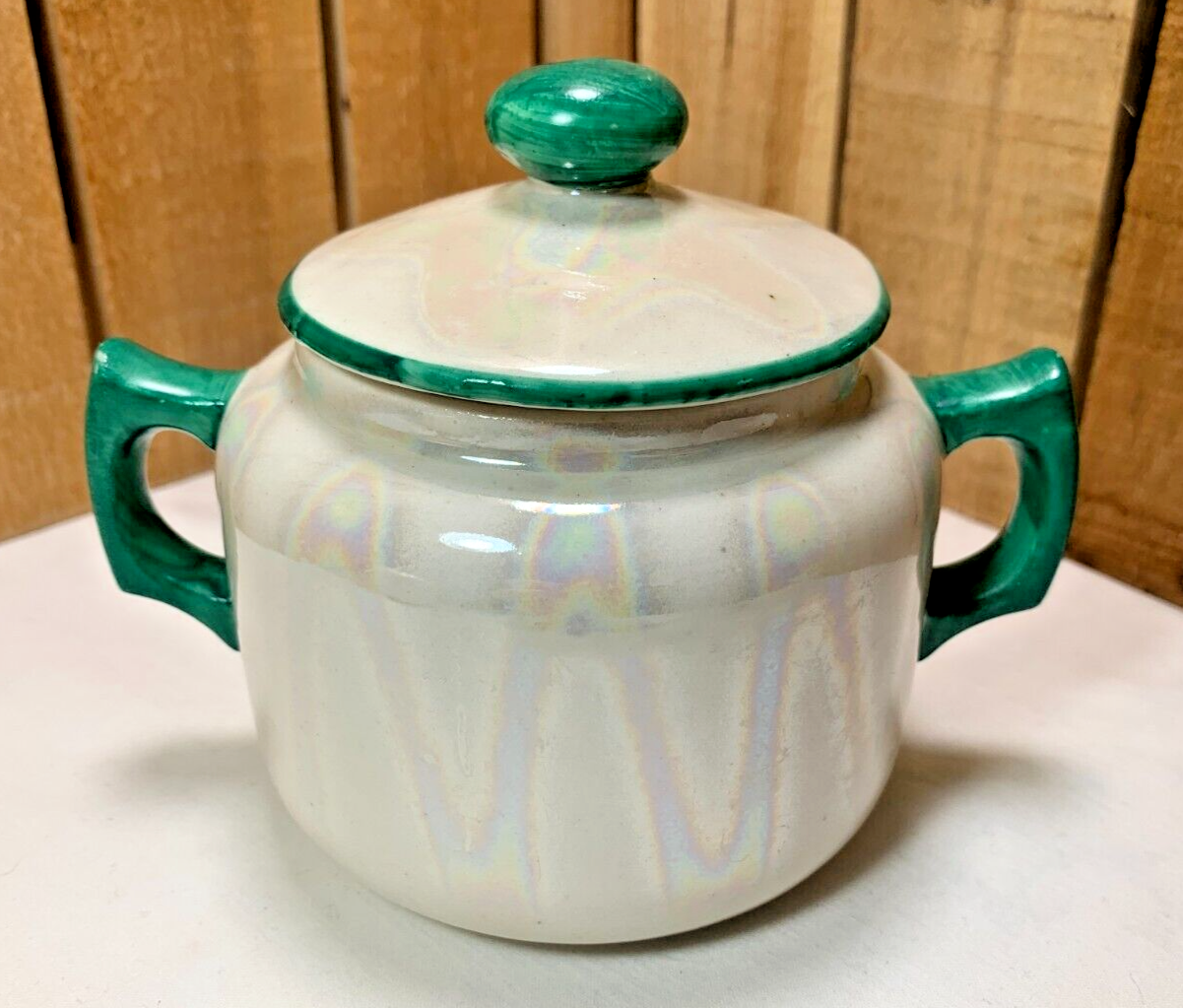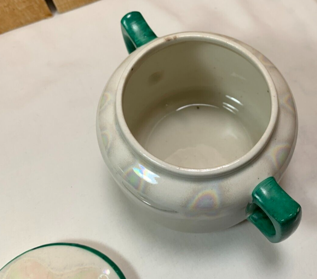 Vintage Iridescent Creamer Pitcher & Sugar Bowl Lusterware Czecho Slovakia Approximate measurements are as follows: Sugar Bowl: 3" Tall, 3.75" Diameter and Weighs 10 oz. Creamer Pitcher: 3.75" Tall, 3.5" Diameter and Weighs 8 oz. We try to find out as much information as possible on each item we have available. On occasion we may make a mistake and appreciate your feedback. These items have some wear from use as seen in the photos. Please see all photos as they are part of the description. We try to list as many details as possible, however some items are vintage and pre-owned so flaws are to be expected.