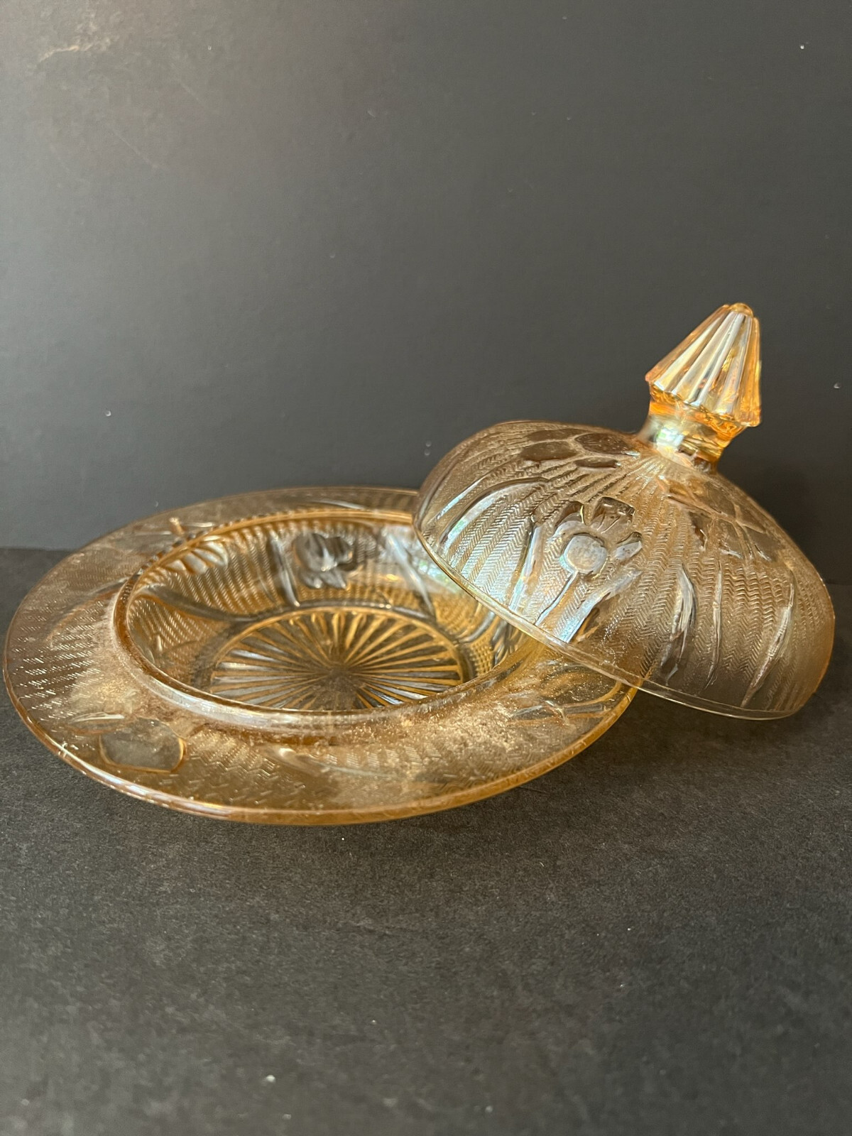 Iridescent Iris & Herringbone Marigold Butter Dish Vintage Carnival Tiny Chip. In great condition , but there is a tiny chip on the underside , I did not notice until taking photos .