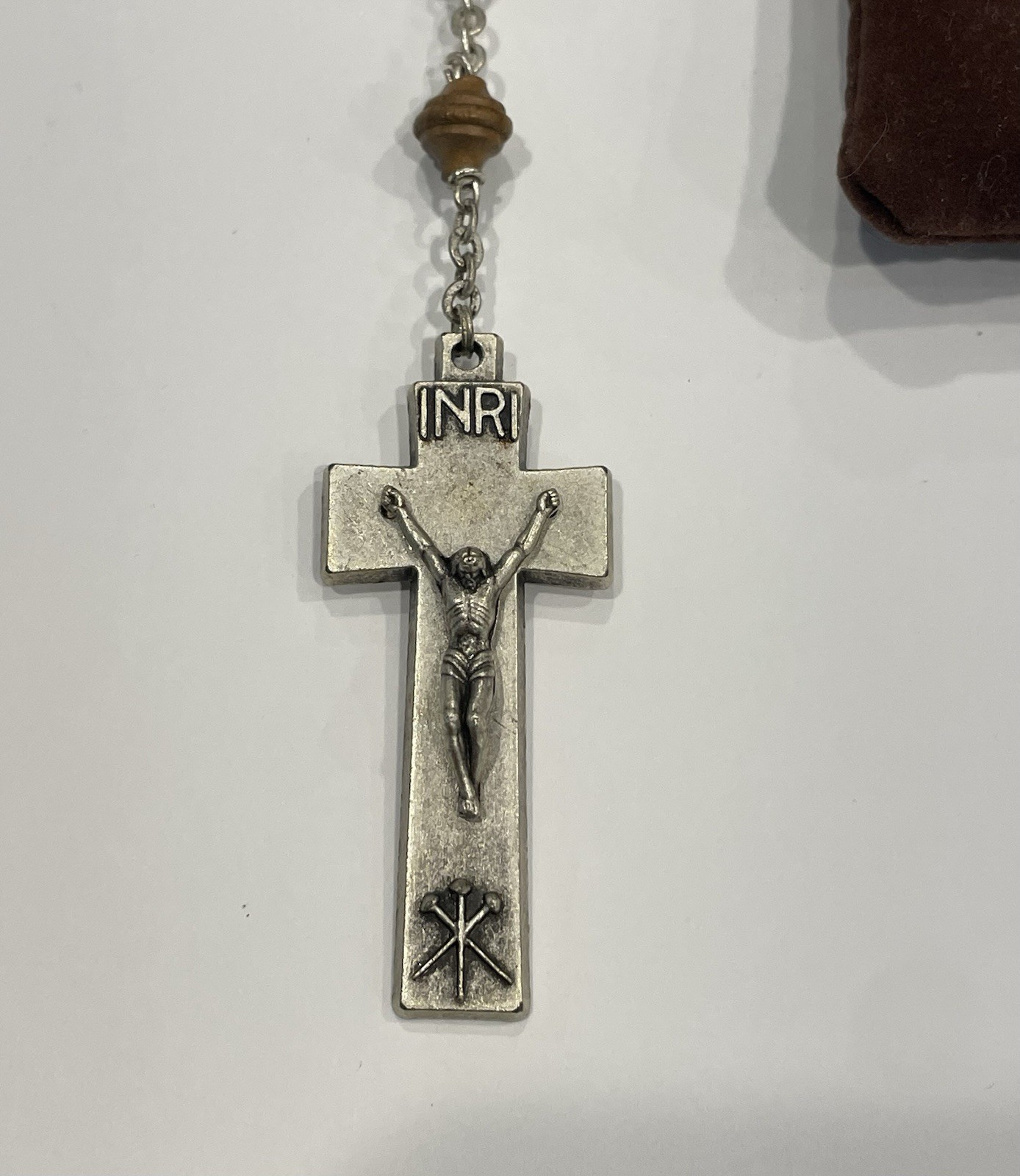The product is a vintage wooden beaded rosary made in Italy, accompanied by a soft brown bag. This religious item is crafted from wood and embodies the tradition and craftsmanship of Italy. Perfect for collectors or those seeking a piece of Christian spirituality to add to their collection, this rosary exudes a sense of history and reverence. Sold as shown in photos.