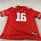 This vintage J. T. Barrett Jersey is a must-have for any Ohio State Buckeyes fan. Made by Nike, this red jersey is a size L and perfect for men. Show your team spirit and pride by wearing this jersey to the next game. The jersey is in great condition and ready to be added to your collection. Get yours now and never miss a game again.