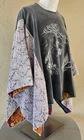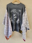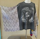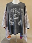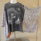 **These Kantha tops are very high-quality, and ALL of the edges are FULLY HAND-STITCHED! I take great pride in the craftsmanship of my Kantha creations! You won't be disappointed!** DESCRIPTION: You will get noticed in this oversized and flowy boho tunic kantha poncho top! It’s comfortable and lightweight for those cool, fall nights and open and airy for those warm summer afternoons. With its vintage AUTHENTIC INDIA KANTHA quilt sleeves and BEAUTIFUL vintage style Jesus Crucifixion print soft cotton shirt, you're sure to make a strong fashion statement! Whether you’re at a campfire, taking a leisurely stroll, or just out for a day or night on the town, this versatile top is suitable for all occasions. This boho, upcycled, The Comfort Colors brand Jesus crucifixion t-shirt was recycled into a unique, original designer top by the renowned fashion designer PEACENIK. The warm and subtle colors of grays, whites, creams, and lavenders will not only lift your spirits but also those of everyone else around you. It has open sides, with a 12” opening armhole, making this shirt lay comfortably and flowing when worn. It is sure to become one of the favorite items in your closet! MEASUREMENTS/SIZING: *The poncho is fully open except for a small 2" side seam inside each arm, which forms an arm hole.* 26” long from rear neck seam to bottom edge. 12" armhole. 55” approximate width with arms outstretched when being worn. ONE SIZE FITS MOST Machine washable and dryer safe for easy care! (Although not necessary, I do recommend washing these tops on gentle cycle and hang drying to prolong the life of the vintage shirts and Kantha fabrics.) This boho top has been upcycled and specially customized in accordance with Peacenik's design process, so please be sure to verify the measurements and details listed here. If you have any questions regarding the upcycling process, please feel free to send me a message, and I'll respond promptly. If you already own any Peacenik clothing, then you already know the level of detail, love, and craftsmanship that goes into each and every handmade piece. WHAT IS KANTHA FABRIC? Kantha is actually a form of embroidery, sometimes used to depict symbols of nature like the sun or the tree of life. With their whimsical fabrics and uneven stitching, kantha throws are fun, colorful accessories. Yet, like other quilting traditions, the art form has rich cultural roots. For centuries in India and Bangladesh, Bengali women stitched together old saris and cloth scraps to form blankets and cushions. “Kantha” is the Sanskrit word for rags, and old cloth was believed to provide protection from harm. Sometimes, several generations of women would work on the same heirloom quilt. Both sides of a kantha quilt are equally decorative but not identical. This shirt is made with superior quality, 3-layer, authentic vintage Kantha quilts imported directly from India! DISCLAIMER: The majority of materials used to create these items are upcycled from a vast, long-time collection of pre-owned quality garments, unique and vintage textiles, and found treasures. This makes these articles of clothing EARTH-FRIENDLY and always ONE-OF-A-KIND! Similar items may be created, but no two pieces will ever be the same! Please review the measurements and photos very carefully. These are newly upcycled items utilizing pre-owned garments, and some normal wear is to be expected unless otherwise noted. Please ask any and all questions prior to purchasing. Due to the custom, specially made nature of these items, all sales are final, and no returns are accepted. Thank you for understanding. SHIPPING: I offer fully secure and insured shipping & handing via USPS Mail. I SHIP FAST!! (Typically, the same day that payment is received.) Please check out my other items for more awesome vintage clothing and unique merchandise!!! Thank you for looking!