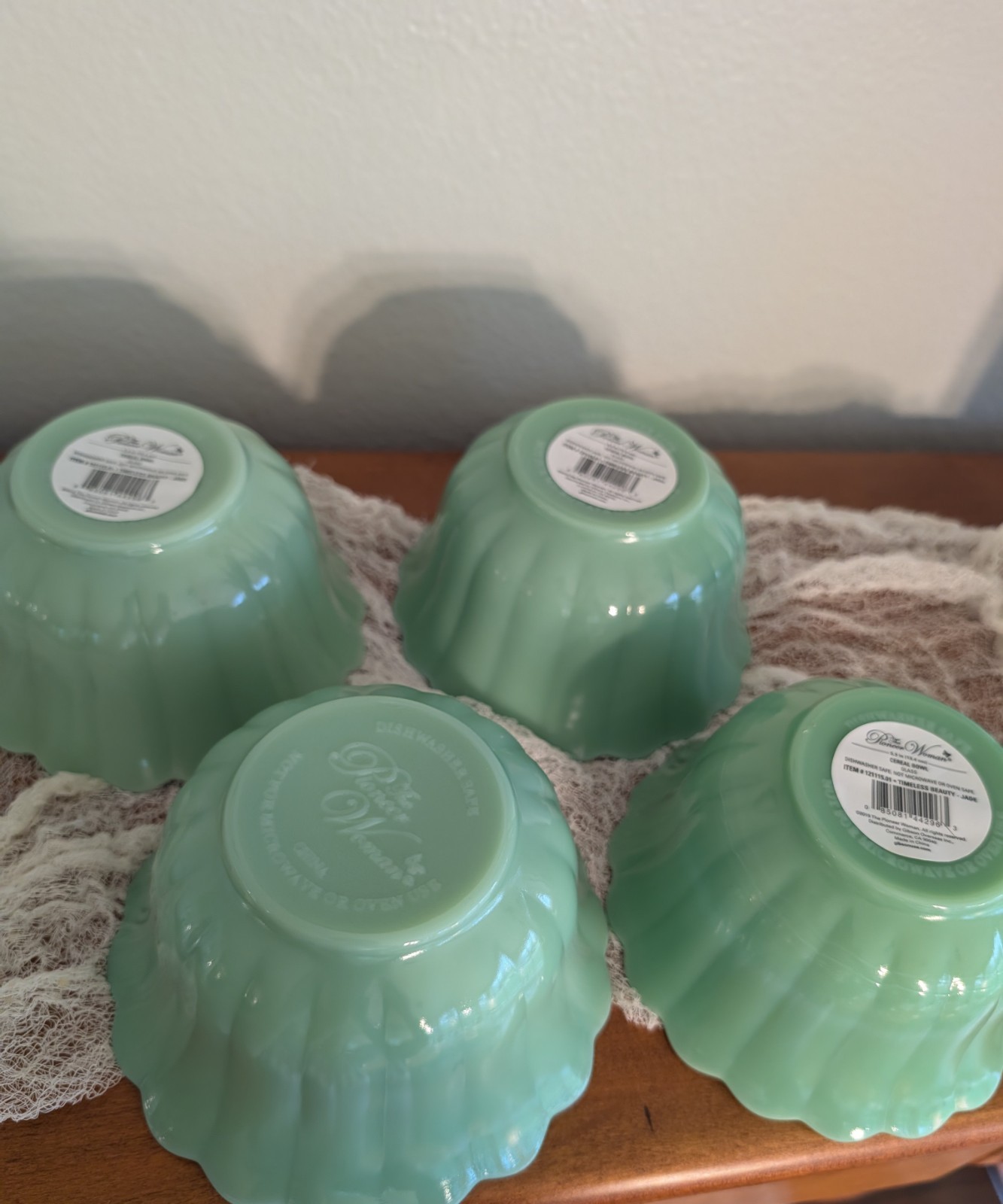 These are in new or excellent used cond. They have been stored for awhile, But don't appear to ever have been used. Stickers still attached to the bottoms of 3. Complete your collection of this beautiful and unique set of jadeite dishes! At the time of manufacturing these dishes were marketed as unique in color variations which you can see in these bowls. Meaning that they may be slightly varied in color either in the dish itself or from on dish to another. Making for an authentic vintage dining experience. Enjoy!