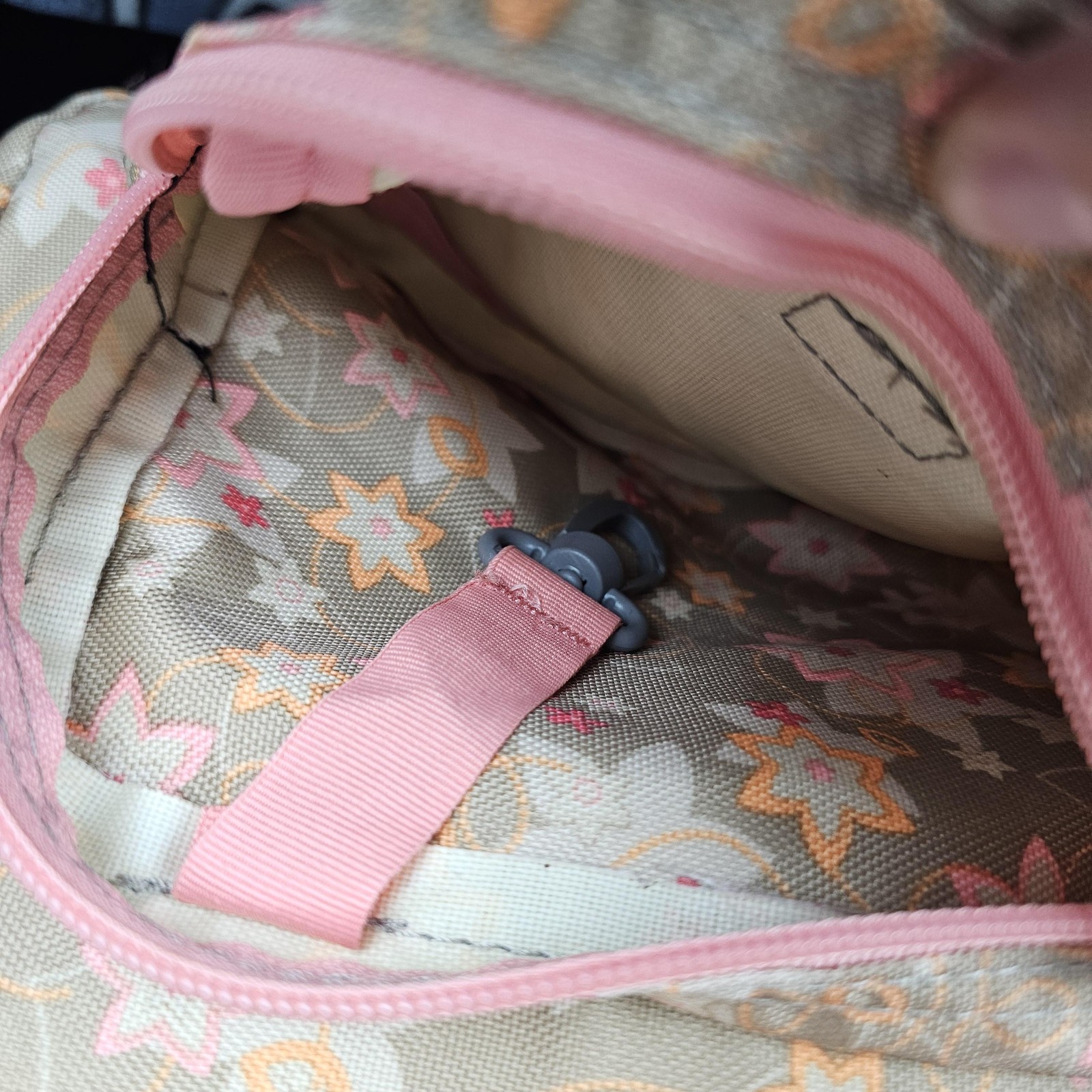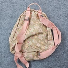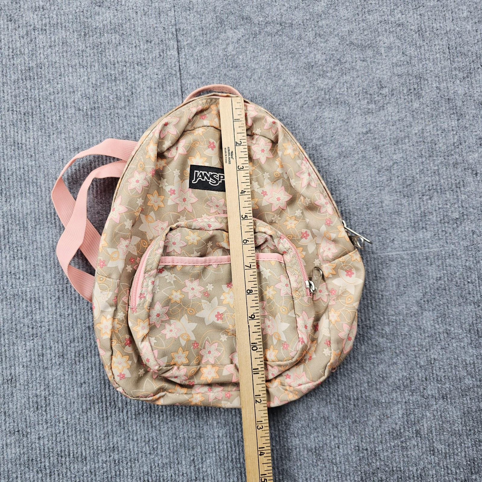 JanSport mini backpack with an allover floral print in tan/beige with pink accents. Brand: JanSport (woven front logo patch on the front pocket). Color/Pattern: Tan and beige base with pink, white, and orange flowers; pink webbing straps and zipper trim. Compartments: Main zip compartment and front zip pocket; lined interior; top carry handle. Straps: Adjustable dual shoulder straps for comfortable carry. Details: Lightweight fabric construction with curved/teardrop silhouette and fabric zipper pulls. Tags: Interior care/origin tag present (text not fully legible in photos). Approximate size: Compact mini profile; please refer to photos for scale. Notes: Review all photos to confirm design details and condition.
