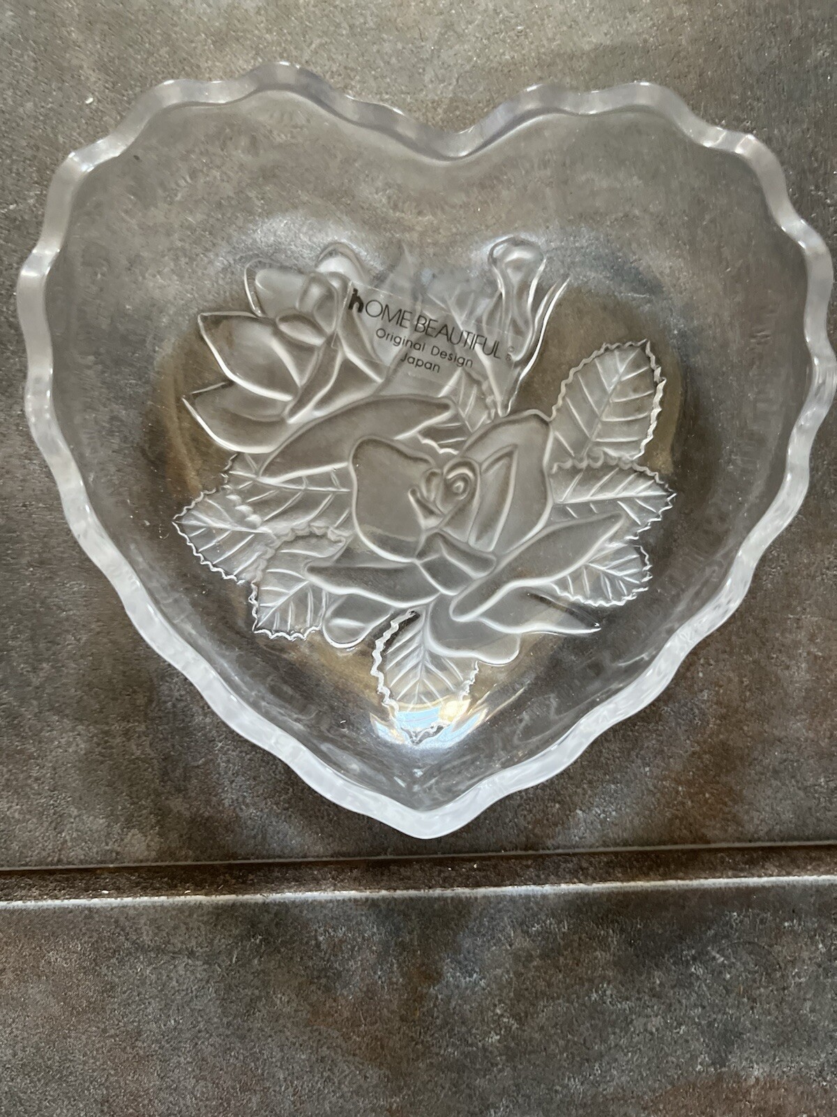 Style:Heart-ShapedPackaging:BoxedAntique:NoType of Glass:CrystalColor:ClearMaterial:CrystalGlassmaking Technique:EtchedOriginal/Reproduction:Contemporary OriginalFeatures:DecorativeCountry/Region of Manufacture:JapanBrand:Home Beautiful JapanMade In:JapanType:DishOriginal/Licensed Reproduction:OriginalModel:Frosted Rose DesignPattern:HeartsObject Type:Candy Dish