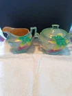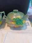 This is a beautiful vintage Japanese tea set that features intricate moriage lusterware details. The set includes a teapot, creamer, and six cups and saucers, all of which are handcrafted and showcase the rich Japanese culture. The provenance of this set is not available, but it is clear that it was made in Japan and carries with it a long history. The attention to detail in the design of this tea set is impressive, with each piece featuring unique floral and cultural symbols. This set would make a great addition to any collection of Asian collectibles, and it is sure to impress anyone who sees it. Whether you are a tea lover or simply someone who appreciates beautiful and unique pieces, this Japanese tea set is a must-have.