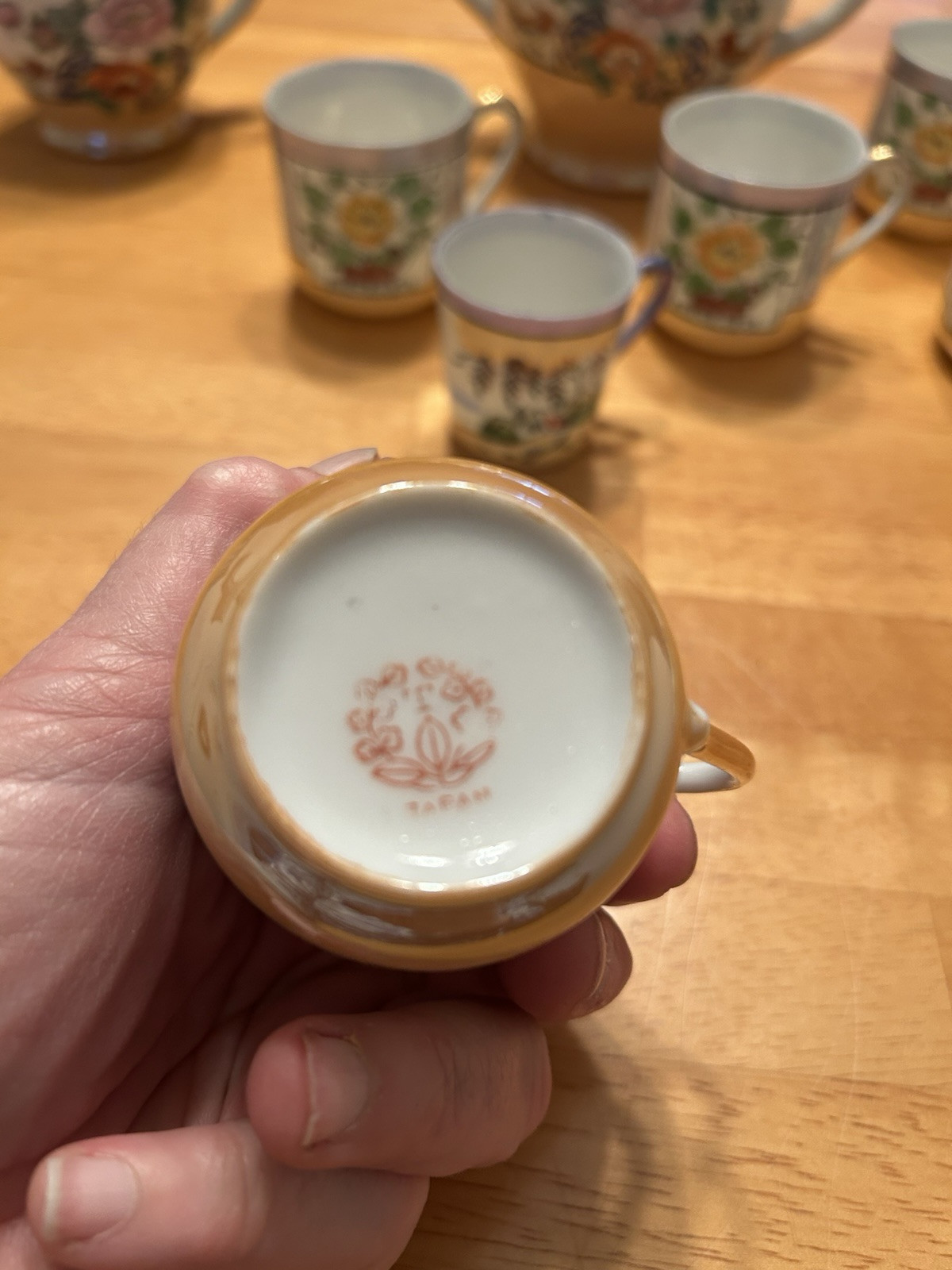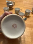 Vintage Japanese Tea Set that includes a creamer and what looks to be a larger pot with a lid for either tea or sugar. The set comes with 5 small cups that are 2 1/2 inches tall and wide and 1 smaller cup that looks to be part of another set. This belonged to my grandmother and I don’t know much more about it. They have been packed away for a number of years and all pieces are intact with no cracks or repairs.