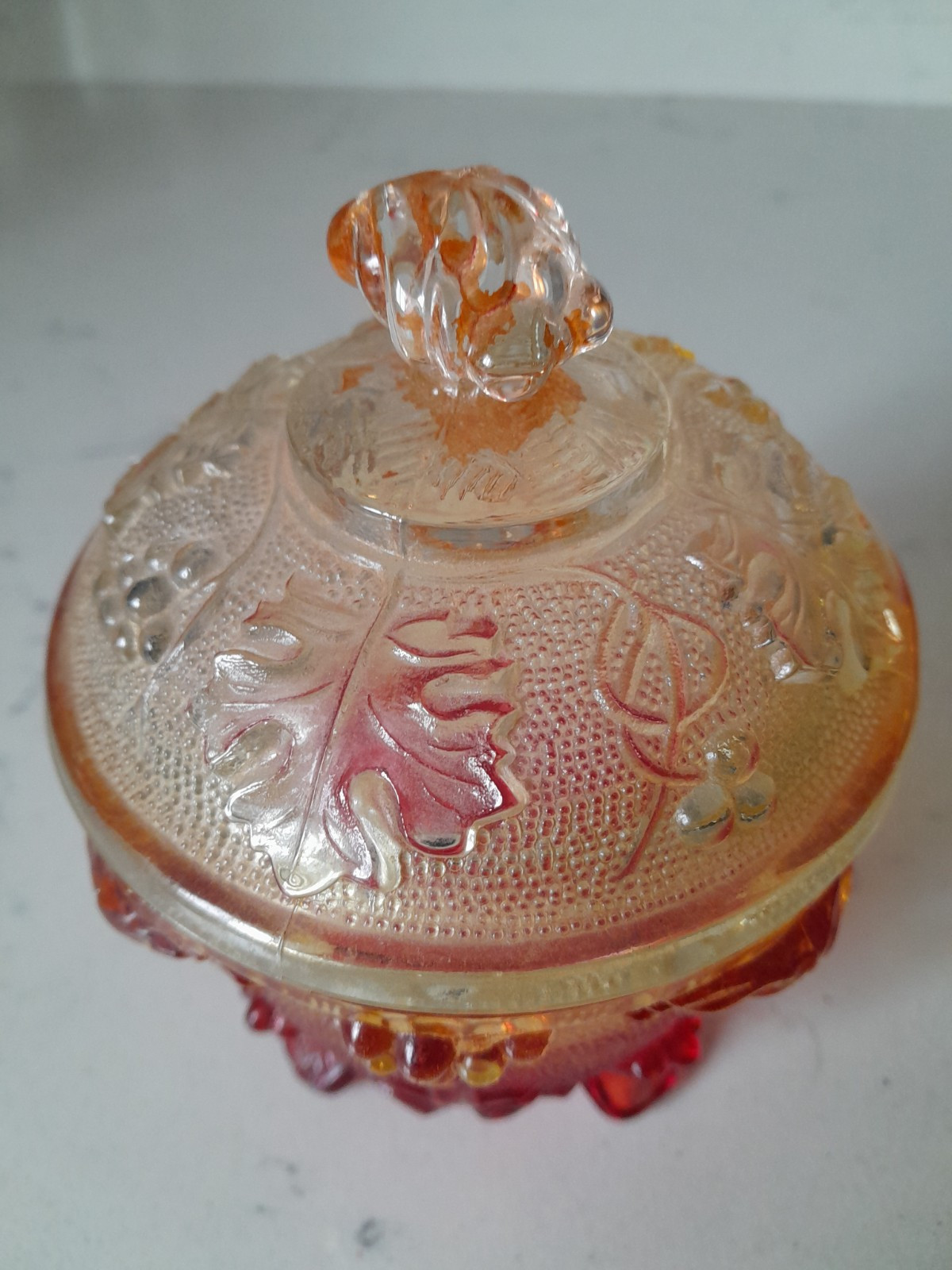 This vintage Jeanette candy dish is a round red glass compote with a lid. It is American-made, dating back to the 1960s. The pressed glass technique gives it a unique appearance, and it has a capacity of 1 cup. Its amberina color adds to its vintage appeal, making it a charming addition to any collection. Some color wear on lid