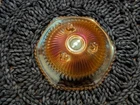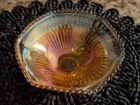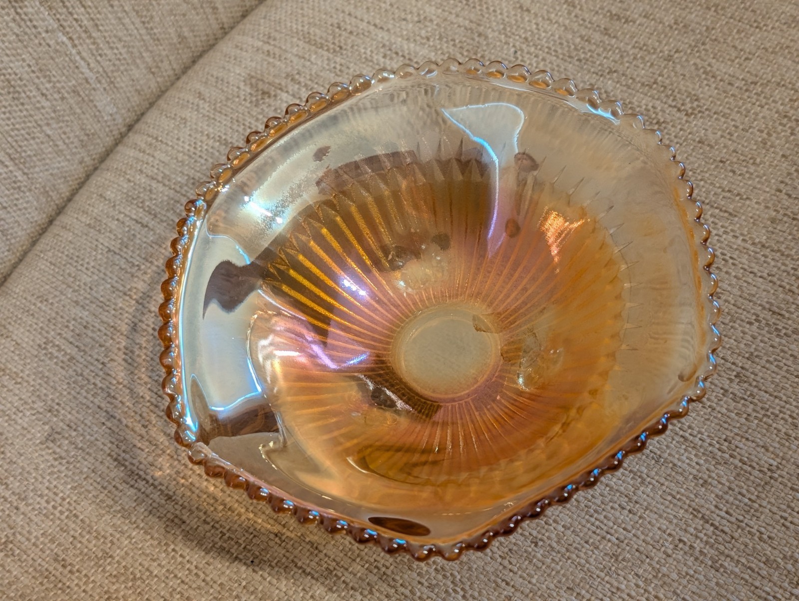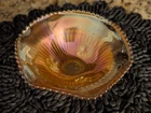 Embrace the vintage charm of this Jeannette Carnival Glass ribbed and ruffled dish, a delightful addition to any glassware collection. The marigold and amber hues capture the eye, while the tri-footed design and iridescent finish add a touch of elegance reminiscent of the 1950s. Perfect for all occasions, this glass bowl is not just a serving piece but a slice of history. This authentic mid-20th-century piece measures 6 inches in diameter and 2.5 inches in length, ideal for showcasing your favorite candies or nuts. Hand wash only care ensures the preservation of its timeless beauty. Proudly manufactured in the United States, this original carnival glass bowl is a testament to American craftsmanship and design.