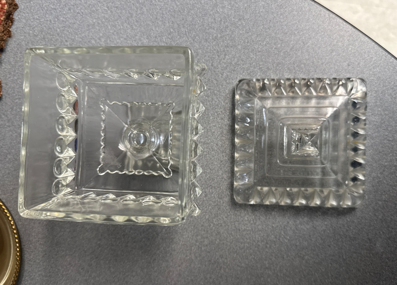 The item in the image is a vintage clear glass candy dish with a lid, likely manufactured by Jeannette Glass Co. It is designed with a square shape, a pedestal base, and a decorative pattern on the lid and body. Purpose: Used for storing and serving candies or small treats. Material: Clear pressed glass. Style: Vintage, possibly Mid-Century. Features: Lift-off lid with a decorative pattern, pedestal base. Era: Likely from the mid-20th century. Collectibility: Similar items are popular among collectors of vintage glassware. Variations: These dishes can be found in various patterns and may also be made of ceramic or metal. Alternative names: Also referred to as a wedding bowl or covered bowl.
