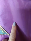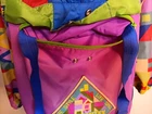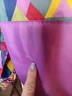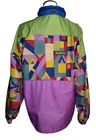 This fun windbreaker jacket does not have a size tag; it measures 20.5" from pit to pit and 26" in length from the top seam of the shoulder to the bottom hem so it is a size large based on the pit to pit measurement. It does have some imperfections as noted in the photographs. There were plastic strings on the inside that melted when I dried it so I did cut those off. It does have a hood that zips into the collar and a snap closure on the kangaroo pocket and a half zip front. Please see all photographs as they are part of the description. Shipped with USPS Ground Mail.