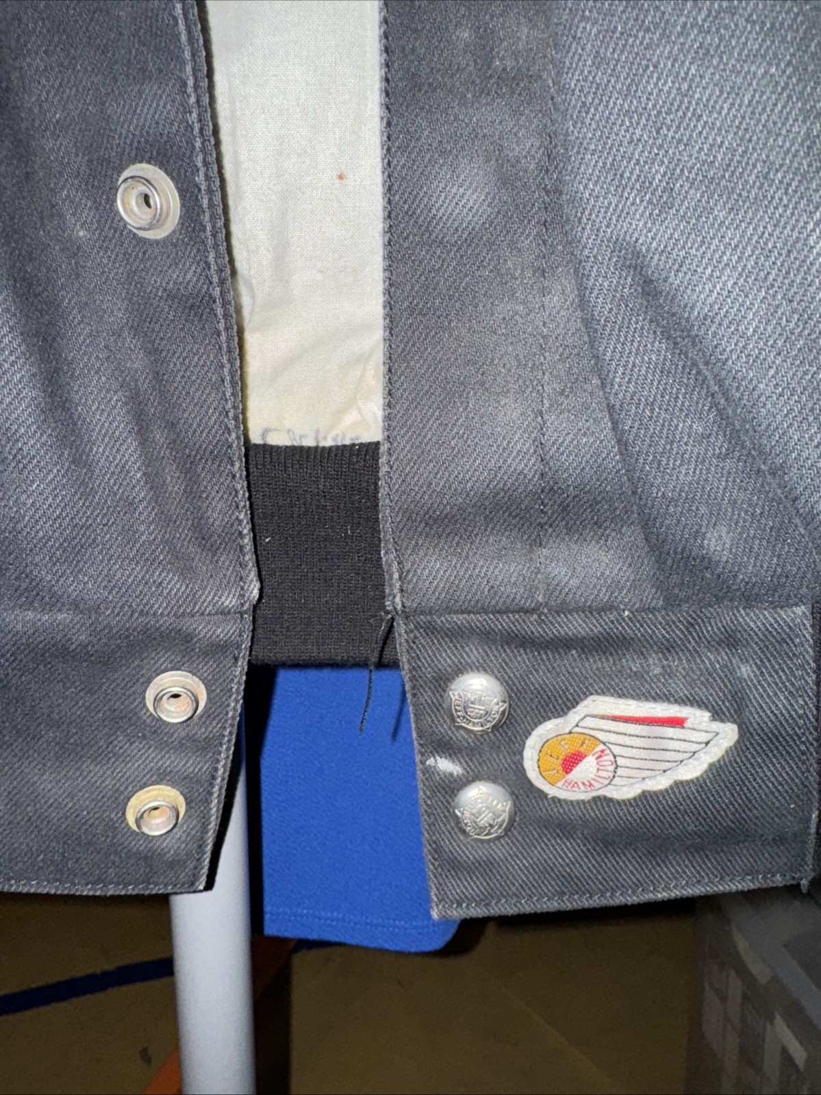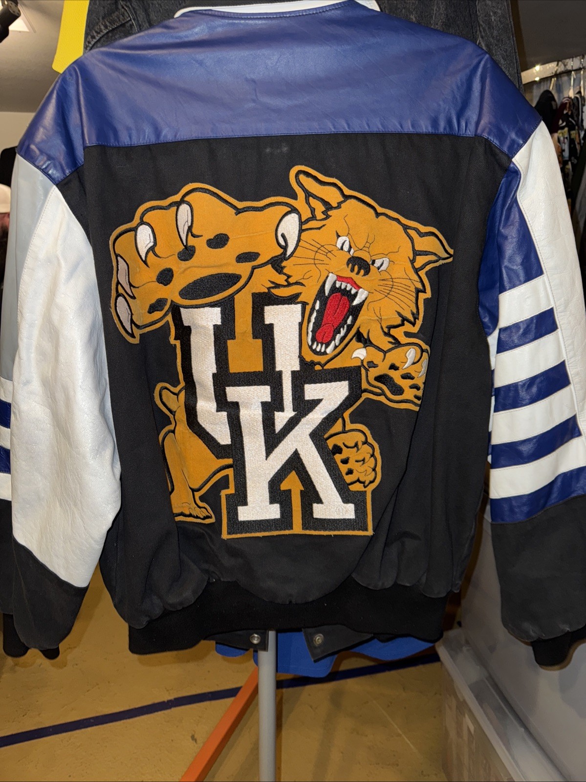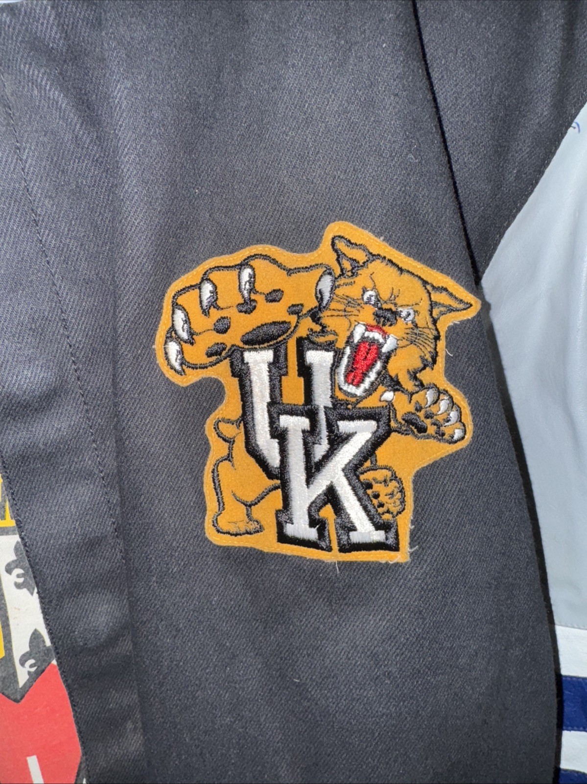 This vintage Jeff Hamilton bomber jacket is a must-have for any NASCAR fan. The jacket features the iconic Wildcats design and is perfect for those chilly days at the race track. The jacket is in great shape and will keep you warm while you cheer on your favorite driver. The jacket is a size large and is made of high-quality materials, ensuring that it will last for years to come. This jacket is a rare find and a great addition to any fan's collection. Please see photos for wear. This has been loved. Sold as is. Hanging