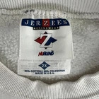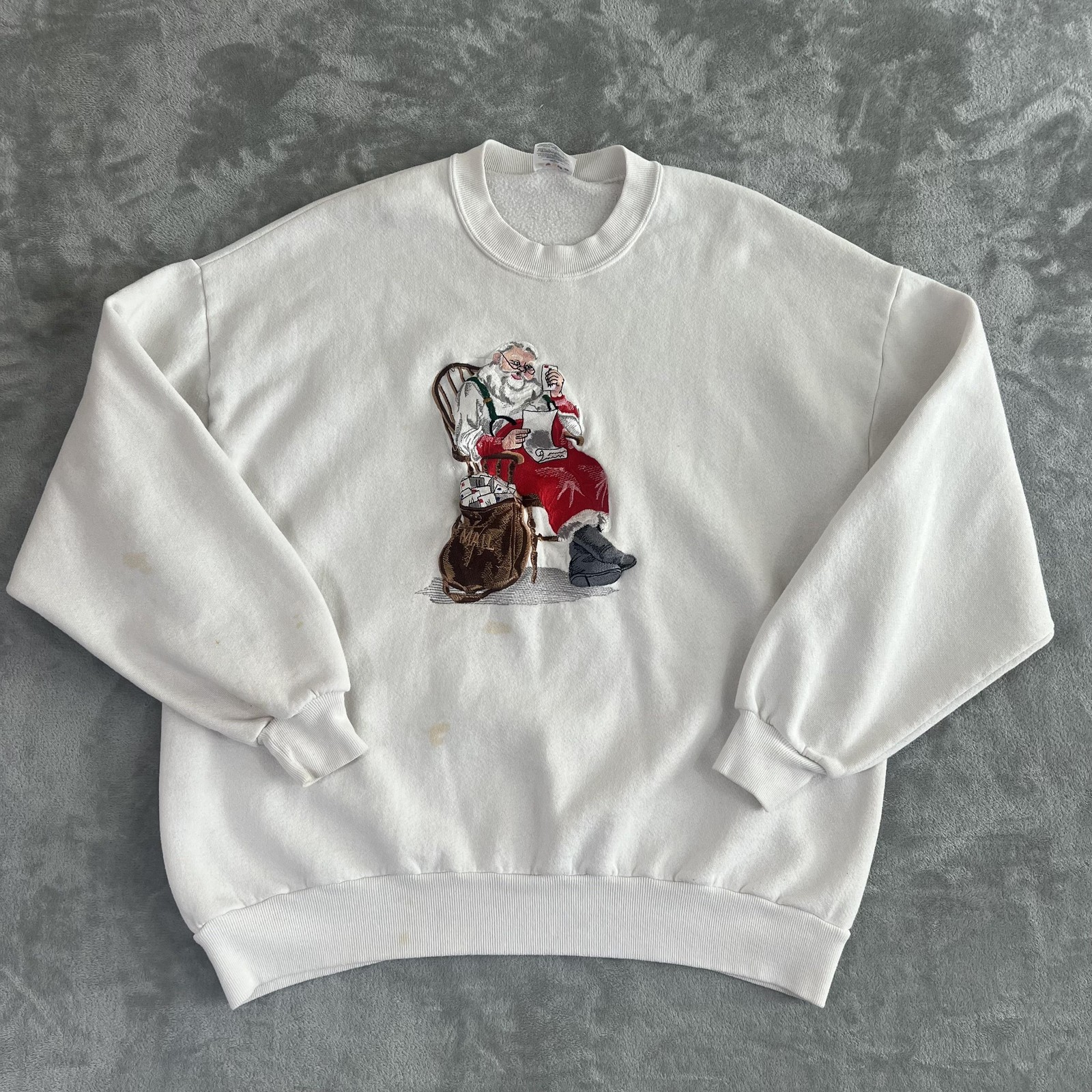 Brand: Jerzees Activewear Style: Vintage crewneck pullover sweatshirt with a large embroidered Santa Claus Christmas graphic on the front. Color: White base with multicolor embroidery. Gender: Mens Size on tag: 2X (approximate Mens 2XL) Materials: 50% cotton, 50% polyester NuBlend fleece; made in U.S.A. (per tag). Details: Ribbed crew neckline, cuffs and hem; soft fleece interior; detailed embroidery of Santa sitting in a chair reading his list with a filled mail bag at his feet; classic holiday and Christmas theme.