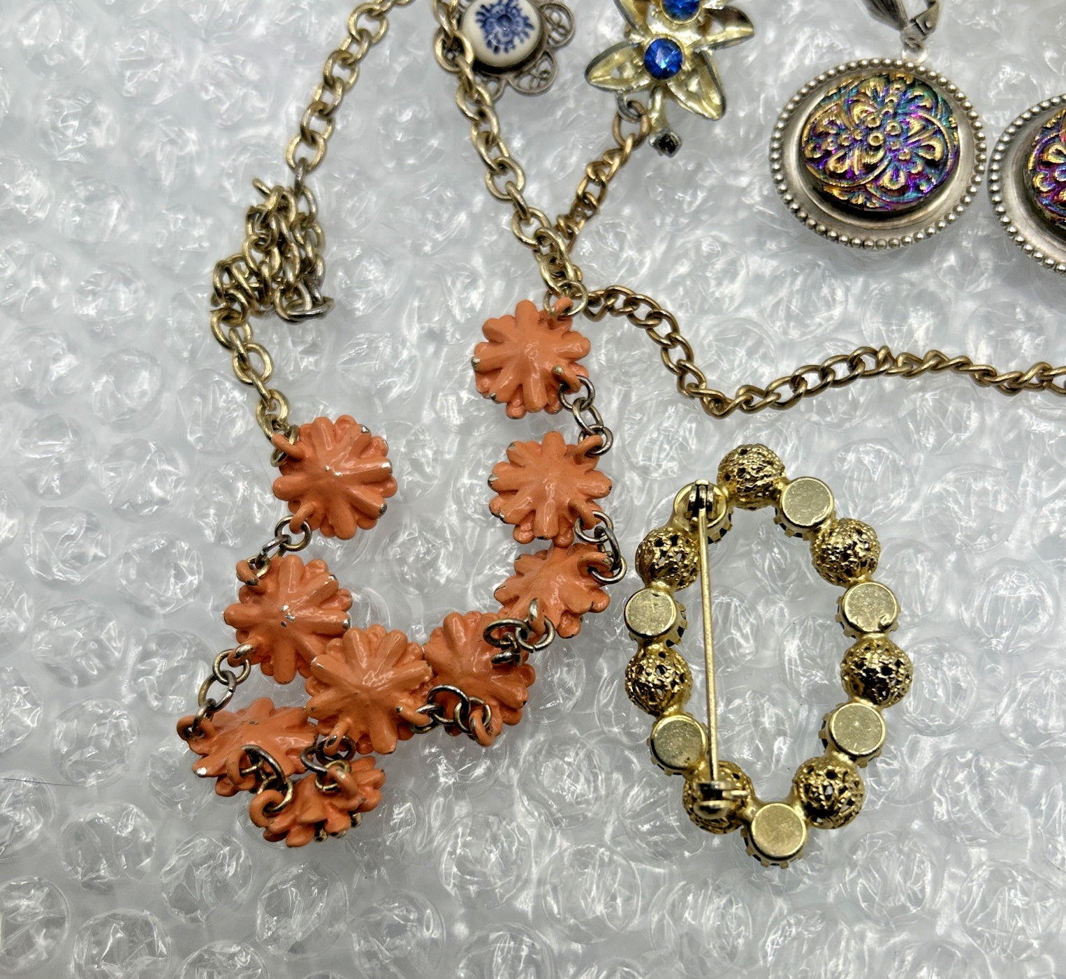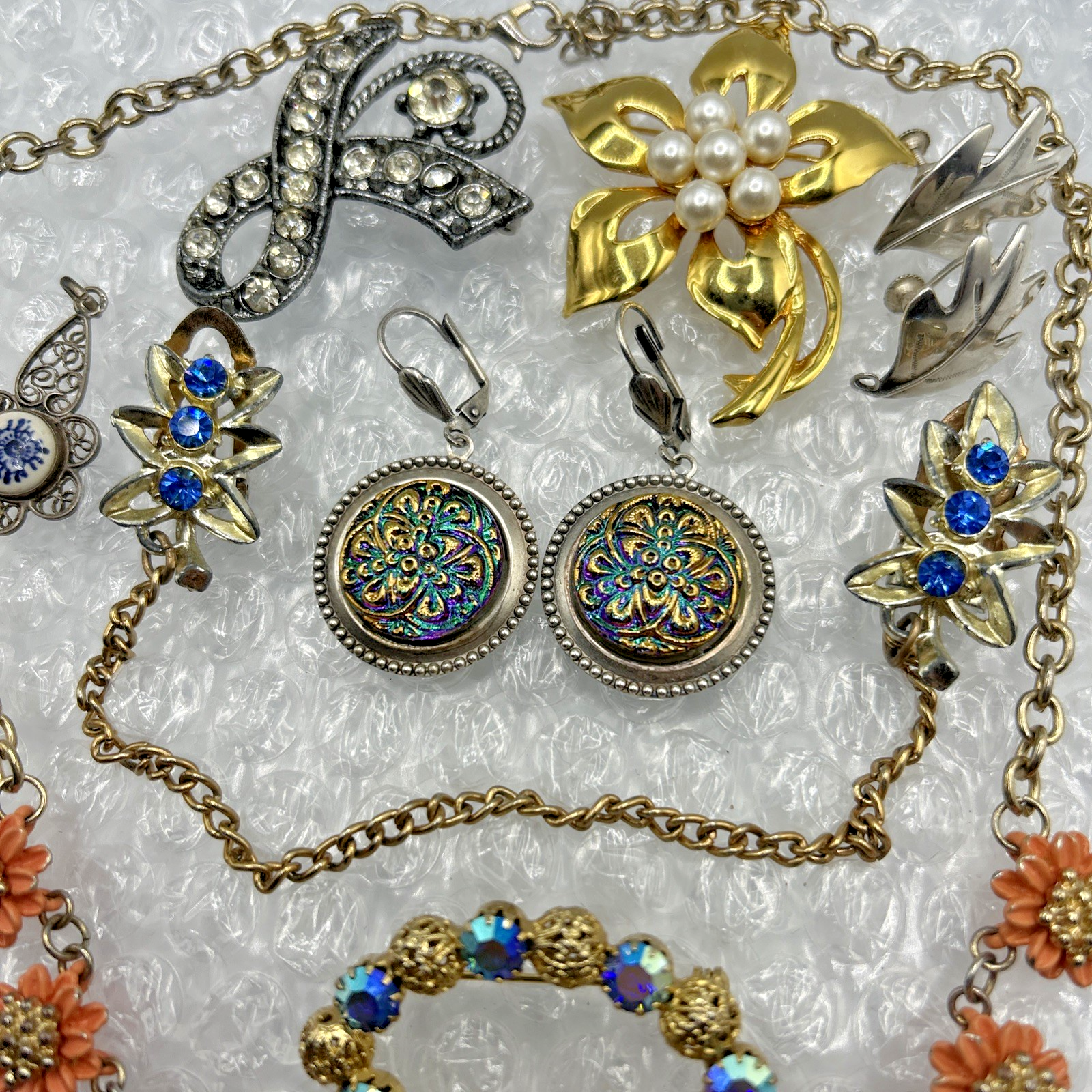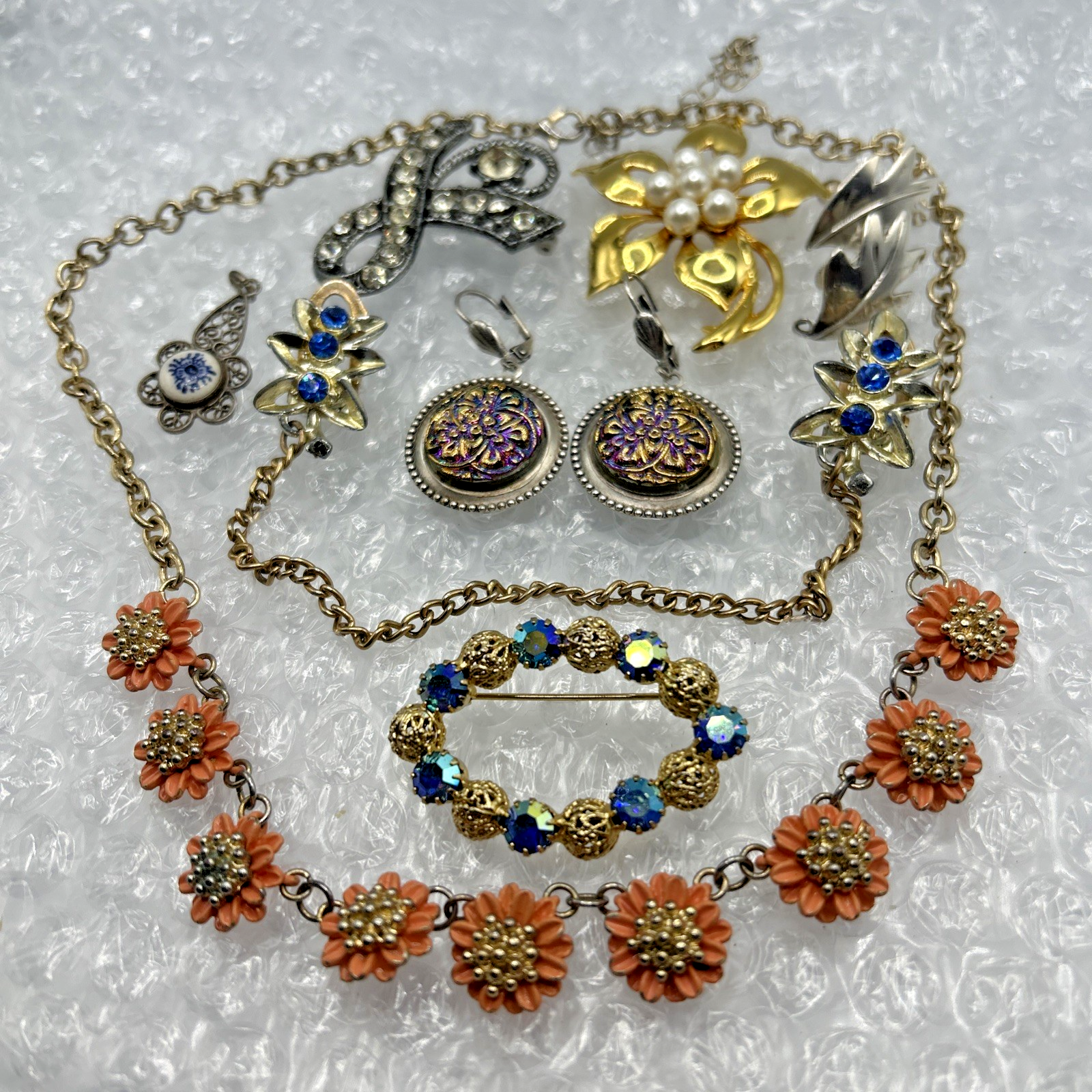 Vintage Jewelry Lot Unsigned 8 Pieces Earrings Necklace Brooches Sweater Clip + Lots of fun and colorful pieces here. The dangle earrings came on a tag that said "vintage Czech glass." The screwback earrings are 925 sterling silver. The pendant has a center of hand-painted porcelain or enamel. Estimated time period 1950s Sourced from Pennsylvania estate NOTE: Any props/tools in the pics are not included Thank you for supporting my small business. CozyVintageJewels offers you can find eye-catching, unique, and charming vintage jewels from Pennsylvania, New Jersey, and New York estates (and beyond) at a reasonable price. I like to find special pieces that tell a story. Please save me to your list, and come see what's here tomorrow! I'm happy to offer competitive prices on multi-item purchases. Thanks for shopping, Jen Cozy Vintage Jewels