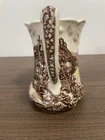 This vintage Johnson Brothers pitcher from England features a Olde English Countryside pattern in a multicolor design. Made of porcelain and ironware, this 24oz pitcher showcases a Village Life and Countryside theme with a glossy finish. It is part of the Countryside product line and is studio crafted in an Art Pottery style. The backstamp is printed on the pitcher.