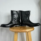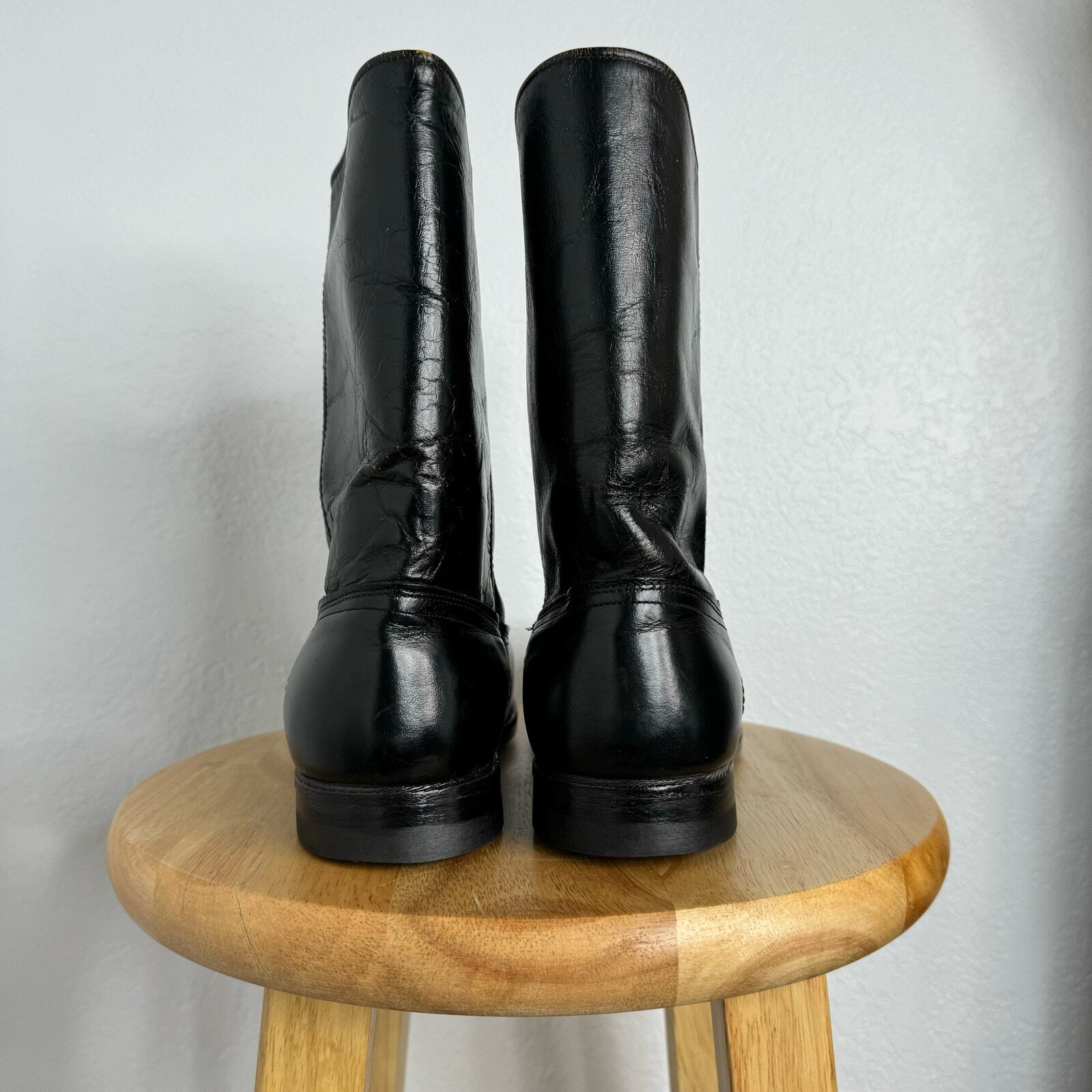 Very rare custom made leather Wellington Style army office dress boots made by the Johnsonian in good condition. We believe they were made in the 40s. Because they were custom made, they do not have a marked size. Please see all measurements to confirm your fit. The inside leather feels so nice. The boots have slightly more heel wear on one side and there is a little black missing, mostly on the back of the heels where one foot was probably used to get the other boot off but also around the top edge and a few other tiny dings. The rest is normal wear creasing and a few small scuffs. The insides are in good condition. There is one small leather ding in one near the top. Please take a look at the photos and the measurements before purchasing. We do not know what size they are so please measure your foot and look at our photos with the measurements.