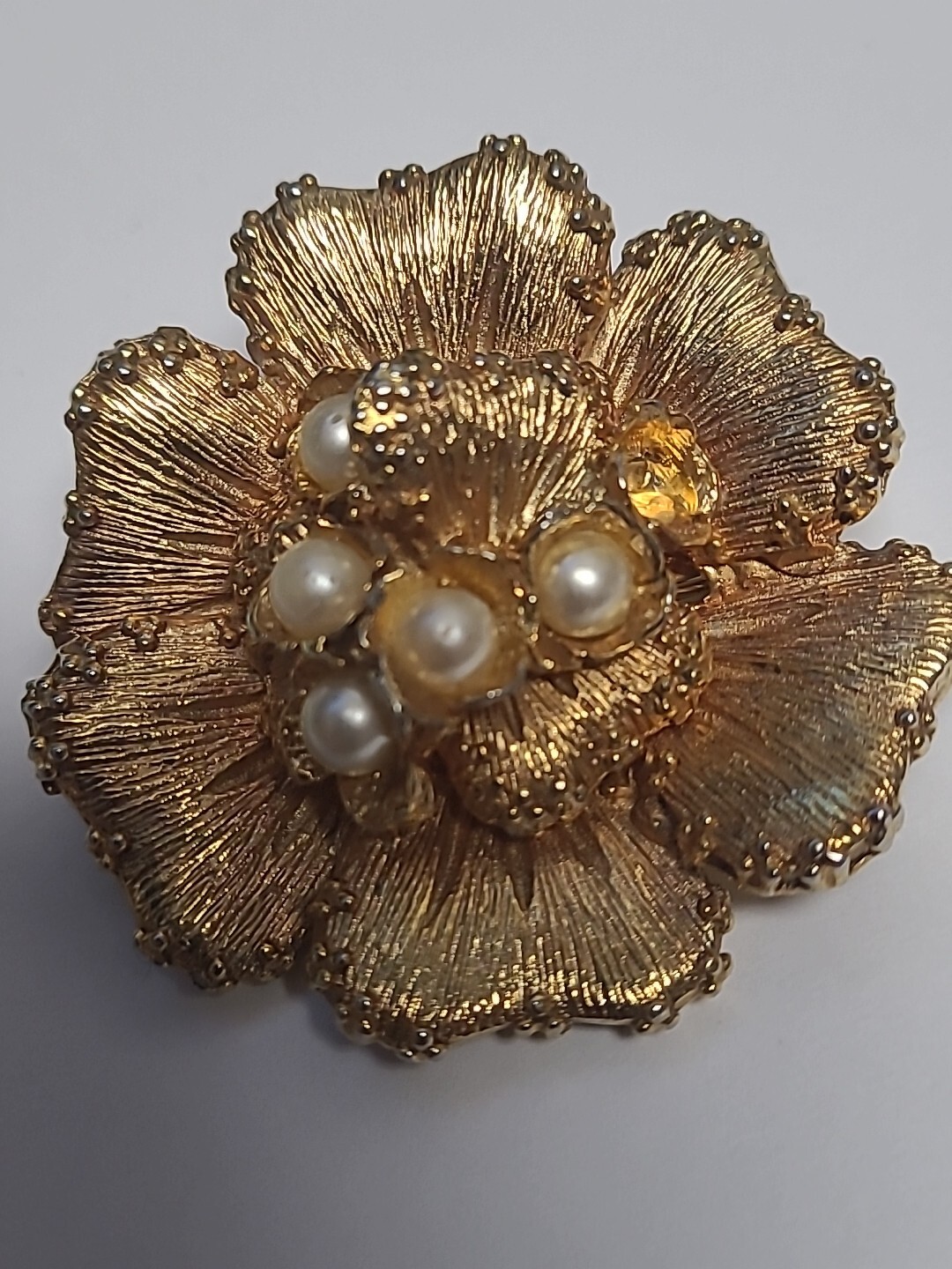 This vintage Judy Lee brooch is a stunning piece of jewelry that is perfect for any special occasion. With its beautiful goldtone base metal and simulated pearl main stone creation, this brooch is sure to turn heads. It's signed by Judy Lee and has a PAT Number, making it a unique addition to any collection. The brooch is perfect for Christmas, Anniversaries, Birthdays, or even Christening ceremonies. Its vintage design is timeless and elegant, making it a perfect gift for anyone who appreciates classic jewelry. This brooch is a must-have for any jewelry lover and will make a great addition to your collection.