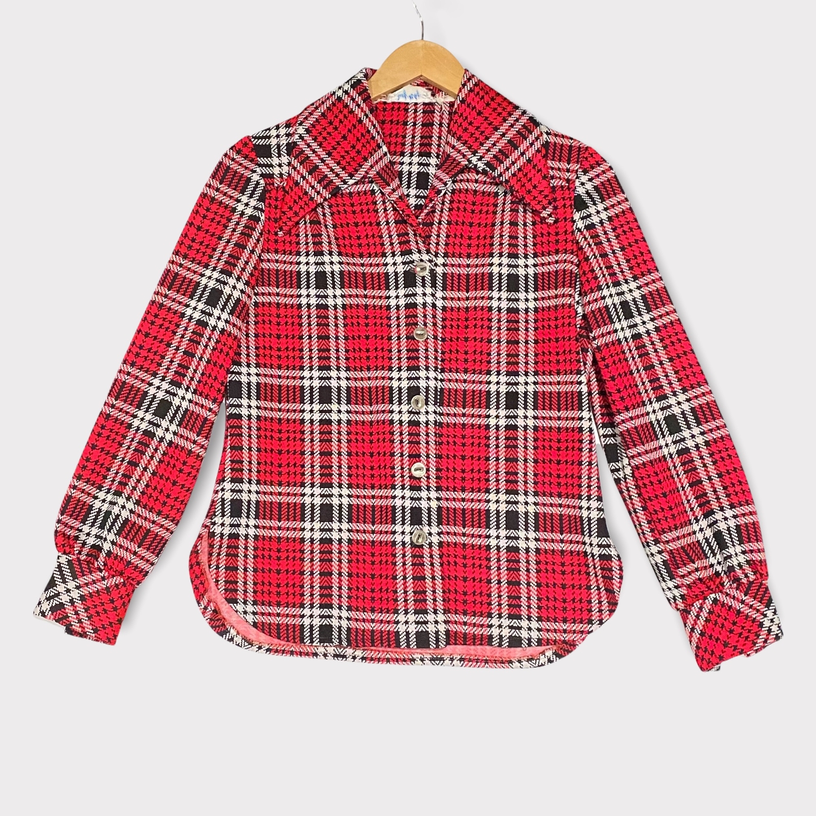 This vibrant red plaid blouse is a stunning vintage find! The wide collar and button-front design give it classic '70s charm, and the colors are still so rich. The fit is true to a small, with a flattering notched hem and button cuffs. It's in pristine condition—no stains or odors, just a bit of wear on the inner tag. A perfect retro statement piece that feels fresh and timeless. Love the slightly rounded hem and how effortlessly it dresses up any outfit!
