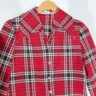 vtg womens Judy Way red plaid wide collar button blouse (no size tag, so please note measurements) length: 25 1/4" armpit width: 17 1/2" button front, wide collar, notched sides, slightly rounded hem, button cuff pristine condition other than the inner tag is frayed, and no size marks able to be visualized. colors are vibrant. no stains or odors. classic 70's fashion piece.