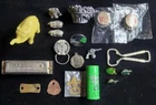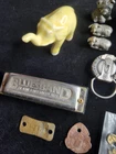 This vintage junk drawer lot includes items related to Silver Jubilee, Hohner, BSA, an 1883 dog tag, a vintage "trunk up" elephant, purported to bring good luck, a vintage Coca Cola bottle opener, etc. The collection consists of 20 items with a variety of unique pieces for collectors. Condition varies between pieces, as shown in pictures. See pictures for condition. LOT 7