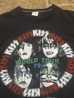 Great graphic on this 79’ tour tee. Blemishes pictured. Single stitch, mounted ringer style collar. Tagged large, but measures approximately 18.5x23.5. This Vintage KISS Original World Tour 1979 Concert T-shirt in Black size Large features a classic graphic print of the iconic rock band KISS, including member Gene Simmons. Made of cotton knit fabric, this unisex tee boasts a crew neck and short sleeves for a comfortable fit. The multi-colored graphic design adds a retro touch, making it a perfect choice for fans of rock music and 70s style.