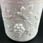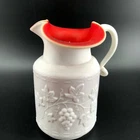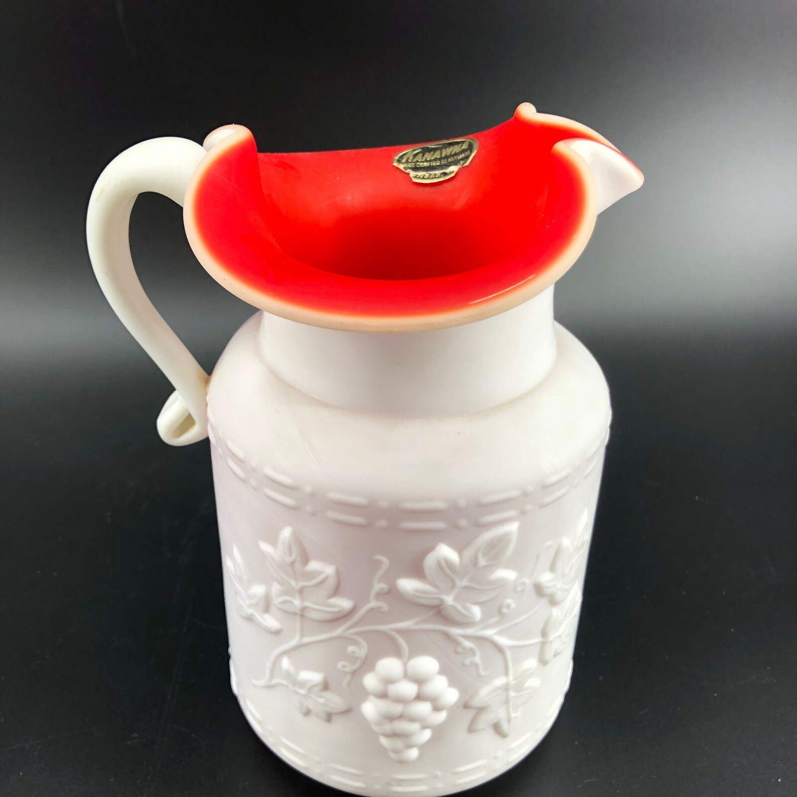 Vintage Kanawha Pitcher Satin Red w/ Overlay Milk Glass Grape Leaf Design 7" Original Sticker Dunbar W. Virginia