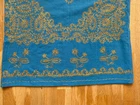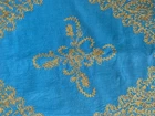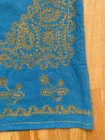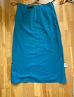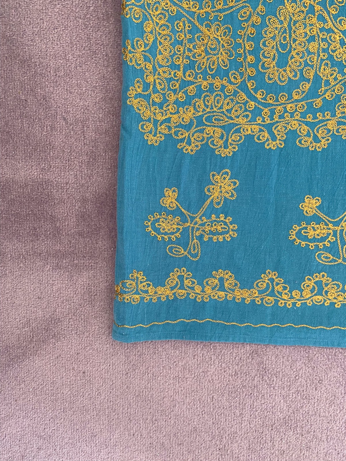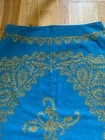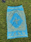Vintage KAREN MILLEN 90s y2k maxi SKIRT in 100% turquoise Indian cotton, heavily and intricately embroidered with a gold thread (slightly metallic thread). Very Phool, Adini, Juliet Dunn vibe, fully lined in cool indian cotton Closes at back with zip, has a decorative beaded tie at the front waist area, fully lined (see photo), elegant and very well made garment, made in India Labelled a 14 and appears true to size, but please see measurements: When laid flat garment measures: across waist 16 inches approx waist to hem 35/35.5 inches approx Very good condition, nearly new, there is one tiny loose thread, just needs tidying up (see photo)