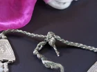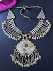 This is very-old necklace was handmade during the early to mid-1900's in Kashmir along the Old Silk Road of Central Asia. It is old vintage tribal jewelry, not a new reproduction. More measurements and relevant info are listed at the end of this description. This style of necklace is a traditional one, having been worn in Kashmir for generations - especially in the romantic Lake Dal region. The distinctive, large pendant in the center has incised floral designs with 2 vibrant red-beads to ward off the evil-eye. Long charm-dangles hang below, swaying with movement. It was very sturdily made, and does not bend. Lots of bold 3-lobed spacer beads extend up the sides, with more charm-dangles hanging freely below. Ornate cone-ends gather the necklace together near the back. There are more-recent ties for adjusting the length. This necklace is in excellent, collectible condition, with a rich age-patina and very mild wear-patterns. Patina reflects the light when photographed, so items often look brighter in images than they really are. Perfect for collectors of old Kashmiri jewelry, as well as for festivals, dance, theater and making a dramatic statement. MEASUREMENTS: Dimensions of Center Pendant = 6 inches long x 4 inches wide Length = Adjustable with ties Weight = 8.6 oz TM image library = 5-7-2025 Please read this about my old/vintage tribal-jewelry beforehand: Because of their age and distinguished history, old tribal and vintage pieces may have some of their dangles/charms/beads missing, replaced, damaged, or refurbished, along with other flaws, defects, and/or debris. Sharp and/or irregular edges are also possible. Because they were handmade, they are rarely symmetrical. Please note that age-patina reflects the light when photographed, so items look brighter in images than they really are. Sold as-is. Not for use by children. Returns gladly accepted within 30 days.