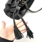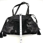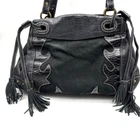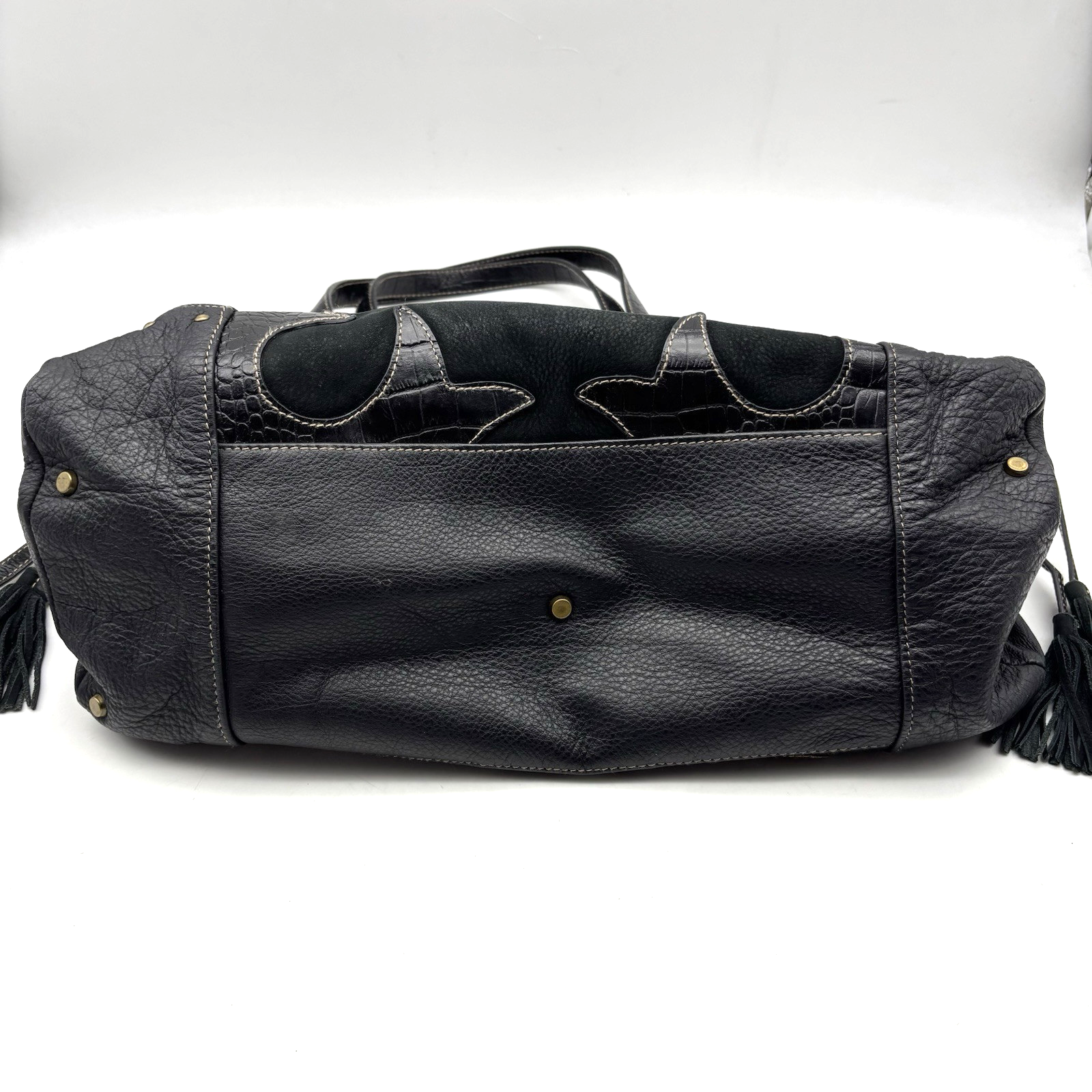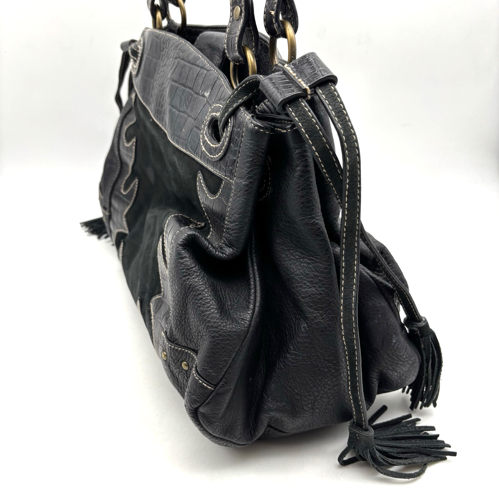 Vintage Y2K Kate Landry Large Hobo Purse Black Genuine Pebbled Leather Body Black Southwestern Croc Embossed Leather Trim Embroidered Contrast Stitching Black Genuine Suede Leather Inlay Black Double Shoulder Straps Black Leather Drawstring with Suede Tassels Magnetic Snap Closure Brass-tone Hardware: O-rings, Stud Accents and Bottom Feet 3 Very Large Inner Compartments 4 Large Zip Compartments 1 Pouch Pocket Very thick, high quality, heavyweight materials! 16" wide 10.5" tall 8" deep 9.5" double shoulder strap drop Great vintage pre owned condition. Gently owned. Small white mark on inner lining - shown in 11th photo. There is glitter in a couple of the larger compartments, I couldn't quite shake it all out :( Clean and from a smoke free home.