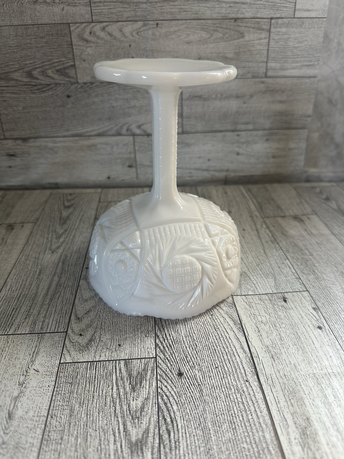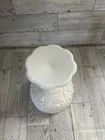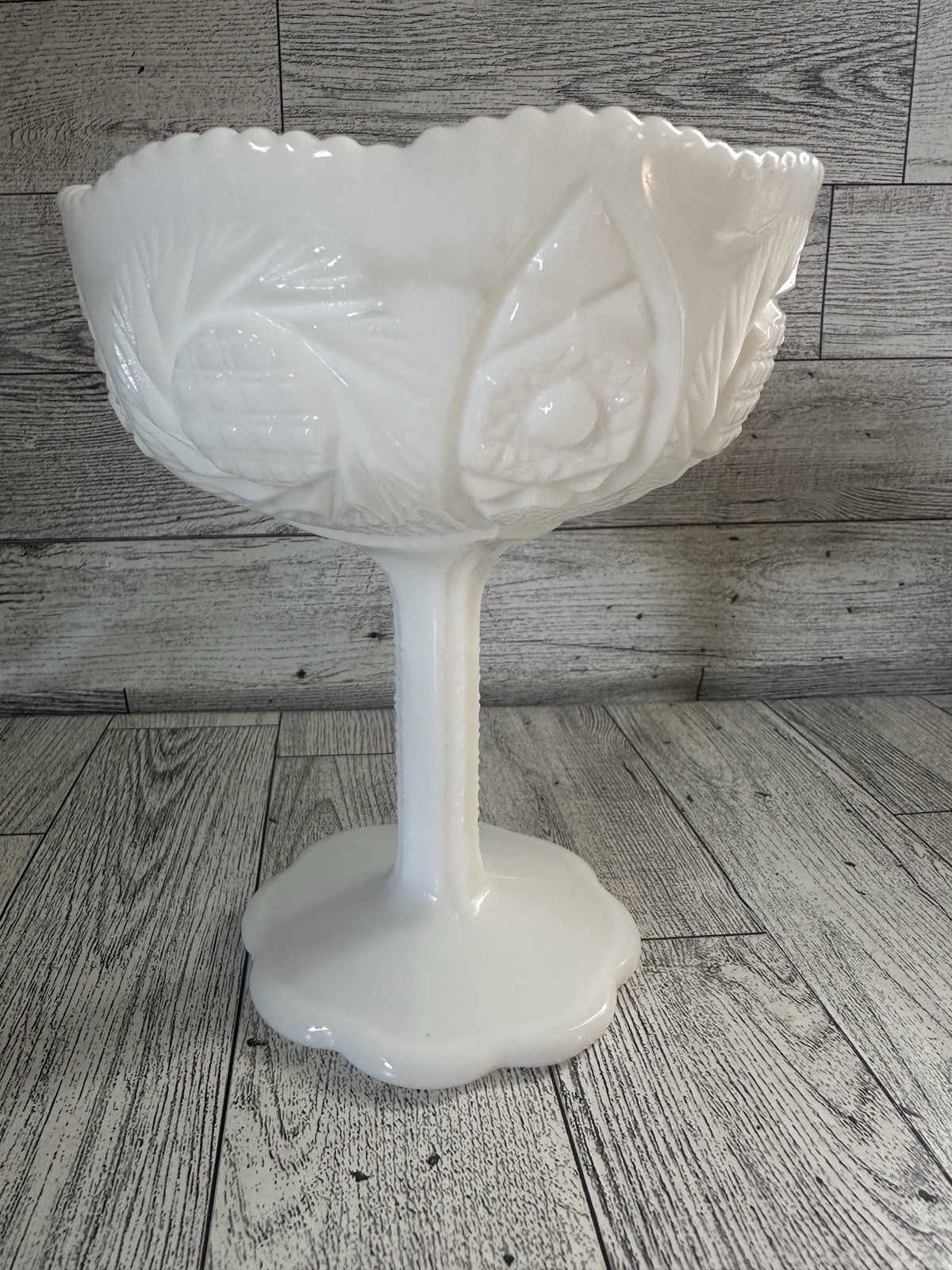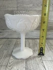 Elevate your vintage décor or collection with this stunning milk glass pedestal compote by Kemple Glass, featuring the highly collectible Pineapple & Floral pattern. This elegant piece showcases intricate pressed designs of pineapples and stylized foliage around the bowl, with a beautifully scalloped rim and sturdy pedestal base. Crafted in the USA between the 1940s–1970s, this compote reflects the timeless charm of mid-century American glassware and was made using molds originally developed by older companies and reproduced by Kemple. It’s perfect as a candy dish, centerpiece, or for collectors of milk glass and fruit-themed patterns. Details: • Maker: Kemple Glass • Pattern: Pineapple Hobstar Fan Floral • Material: Pressed milk glass • Color: Opaque white • Type: Pedestal compote / candy dish • Dimensions: Approx. 5.75” tall x 4.5” wide () • Condition: Excellent vintage condition with no chips or cracks. Minor wear consistent with age. Perfect for: • Milk glass collectors • Farmhouse or vintage-inspired home décor • Wedding table centerpieces • Gift for vintage lovers
