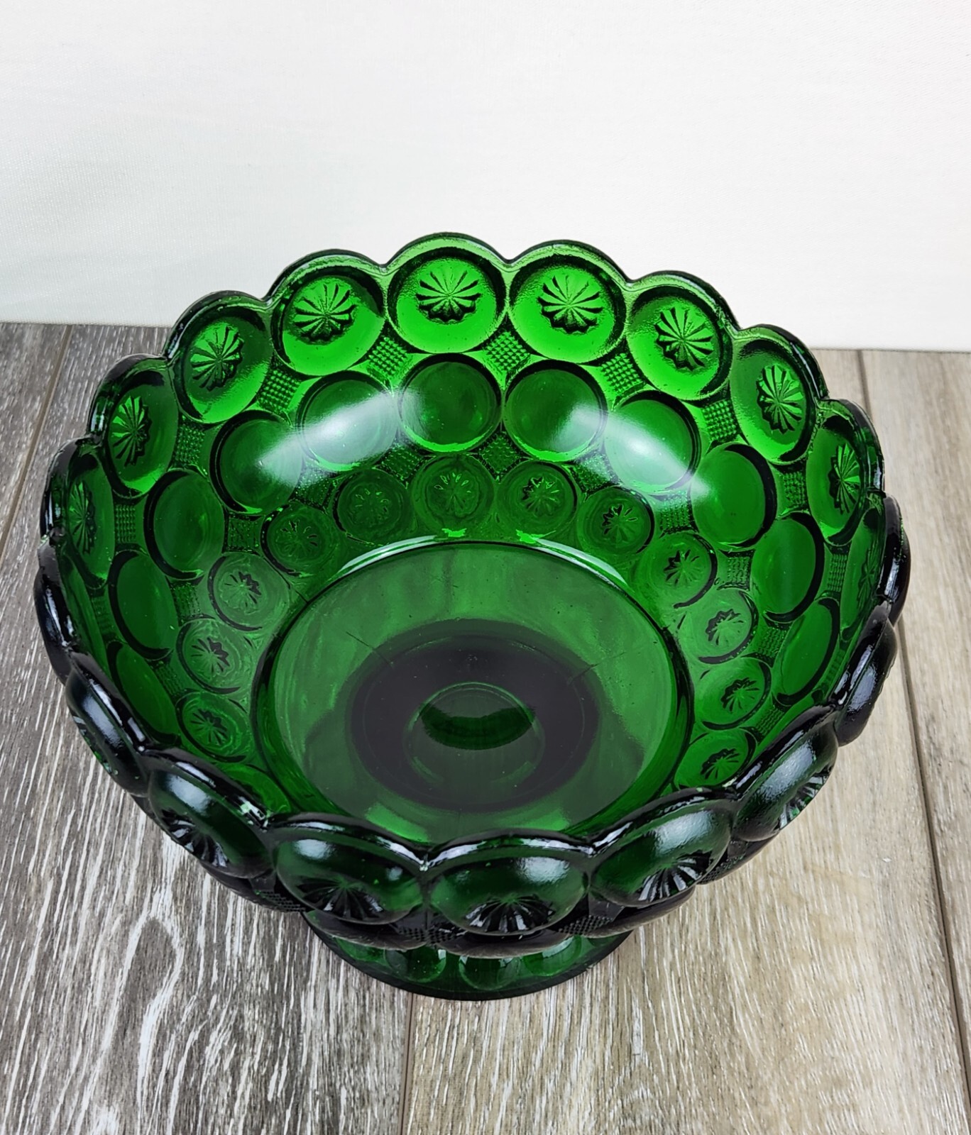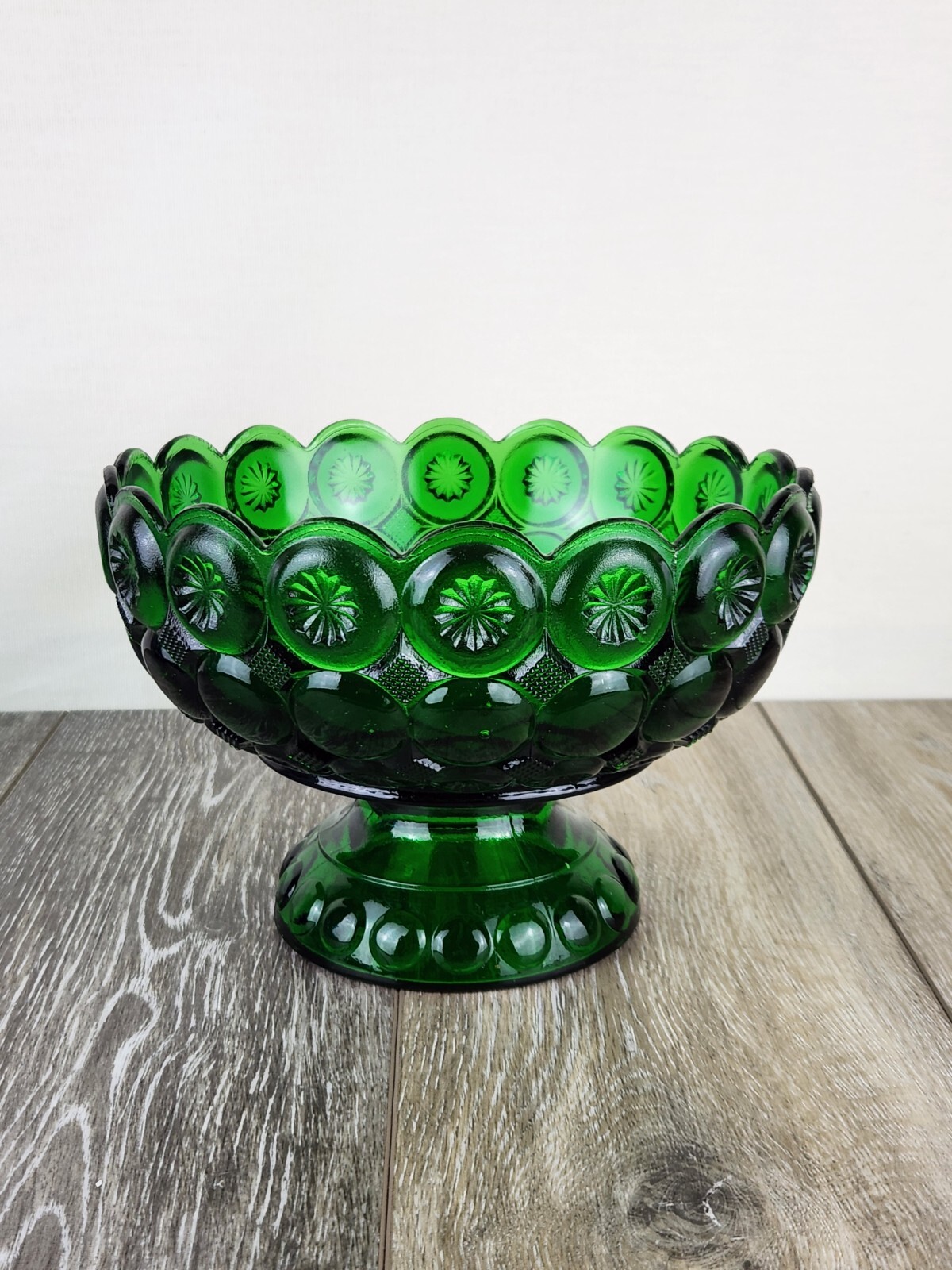 Give the gift of vintage charm with this emerald green Moon & Star compote dish by Kemple Glass. Ideal for collectors, vintage lovers, or those looking to add vibrant color to their home, this 1960s-era piece works well in farmhouse, boho, or retro spaces. Display it solo or pair it with other Moon & Star pieces for a gorgeous glassware set. *Excellent condition!