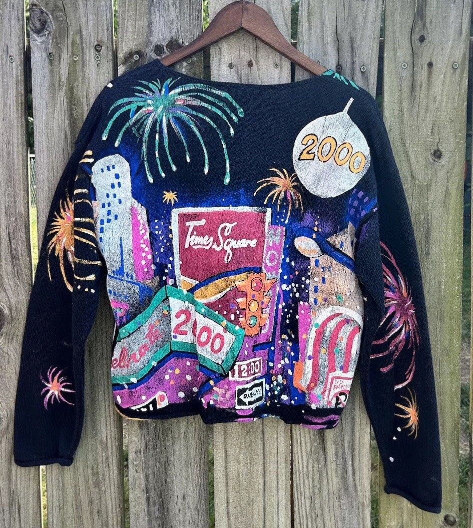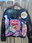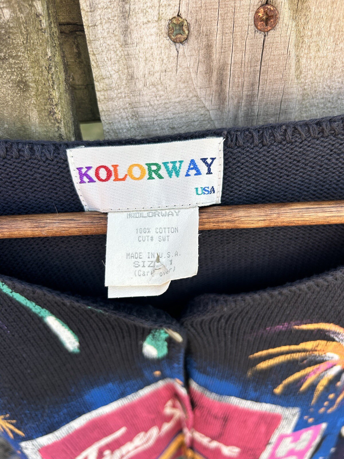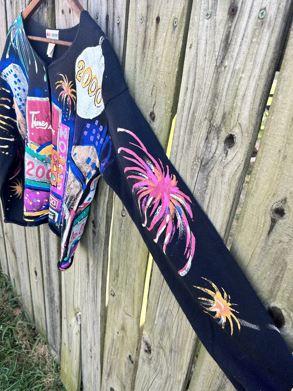 Vintage Kolorway Hand Painted Art to Wear Sweater Y2K 2000 Times Square Large Width: 21" Length: 22” Used, vintage, or older items may show a few signs of wear or slight fading due to age. Anything visible (stains/holes/etc.) are a possibility, if not shown initially. Please review photos carefully. Item sold as is. No returns.