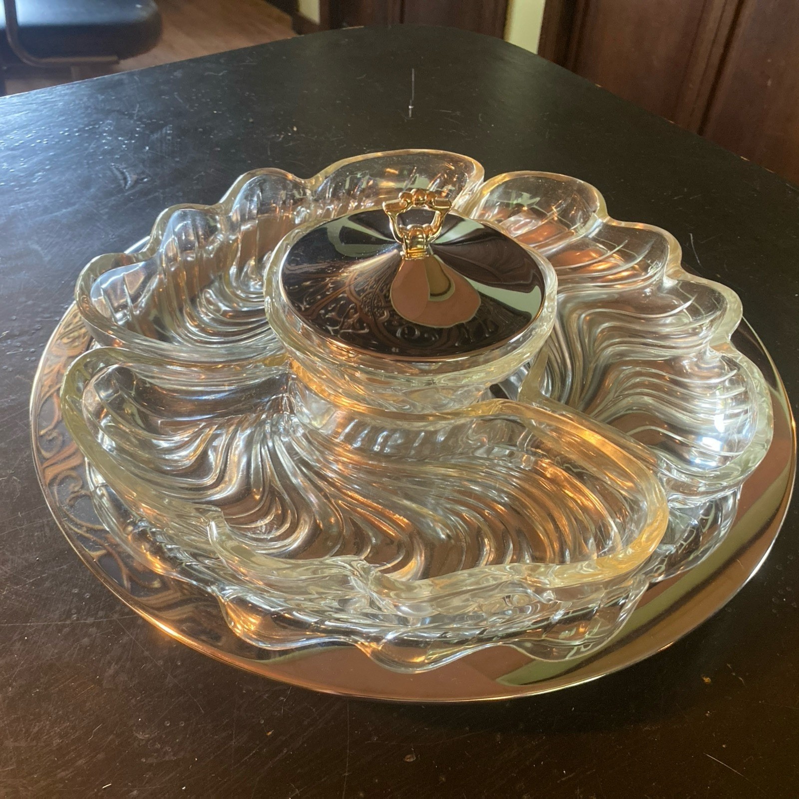 In excellent condition. New open box. 1950s Lazy Susan. Metal Lazy Susan with three thick glass compartments and one center glass bowl with metal lid. All measurements are in pictures. Ships the next business day after payment😊