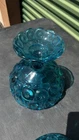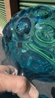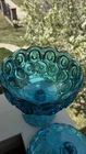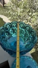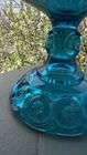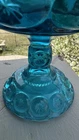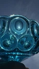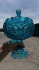 This is a vintage-style glass candy dish or compote with a lid, made from vibrant blue pressed glass. The piece features a pedestal base and an ornate pattern known as “Moon and Stars,” which is popular among collectors of mid-century and early American pattern glass. The lid has a decorative finial for easy lifting, and the glass reflects the light beautifully, highlighting the detailed embossing. This type of dish is often used for serving candies, nuts, or as a decorative centerpiece. There is a small chip on the outside and one scratch on the inside.