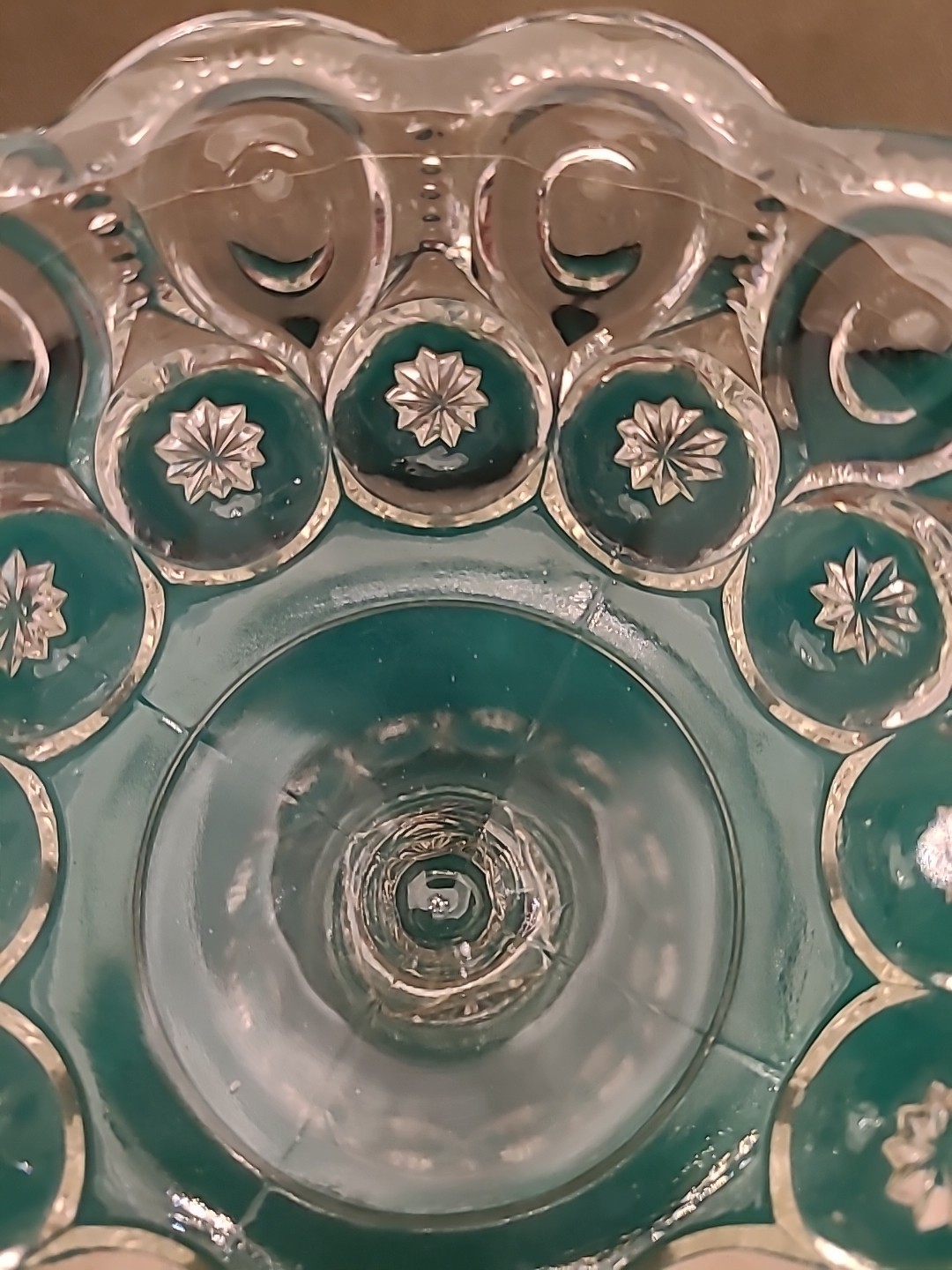 This vintage LE Smith Moon & Stars Pedestal Compote/Clear Candy Dish is a beautiful piece of pressed glass originating from the United States in the 1970s. With a Victorian style and a charming moon and stars pattern, this candy dish features a classic clear color and a beautiful shine finish. The pedestal design adds an elegant touch to the piece, making it a unique and collectible item for any glassware enthusiast or vintage decor lover. No chips or cracks.