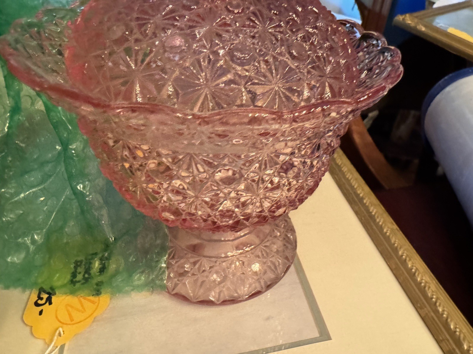 The Vintage LG Wright Pink Daisy & Button Candy Dish/Compote with Lid is a charming piece of mid-century modern glassware originating from the United States. With a delightful daisy and button pattern in a vibrant pink color, this original LG Wright design exudes nostalgia and style. Made with pressed glass, this vintage compote with lid adds a touch of retro flair to any space it is displayed in, making it a unique and lovely piece for collectors or home decor enthusiasts.