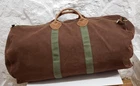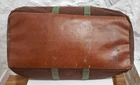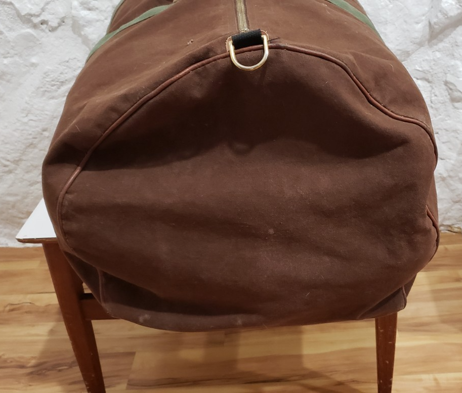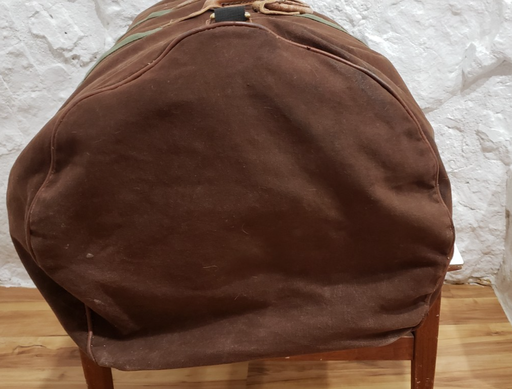 Vintage LL Bean Large Duffle Bag Brown Tote Canvas Leather Handles Bottom Strap Bag has some wear as shown in photos, a few small holes and some discoloration Measures at bottom 27.5" 12.5"
