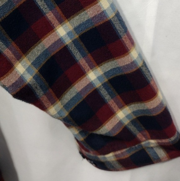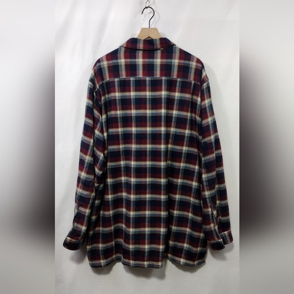 Cozy plaid flannel shirt with button-up front. Features a classic check pattern in red, blue, and cream. Features Red Blue Plaid Collared Button front Chest pockets Fleese lined Boho Retro 90s Y2K Casual Comfy Cozy Warm Winter Western Cotton Good Pre-Loved Condition One fixed hole, please check the last picture. SIZE XXLT Measurements Pit to Pit: 28.5" Length: 35" Waist: Rise: Inseam: Length: Please check to be sure of fit Smoke Free Pets Free Please feel free to contact me for any questions or offer Bundle Discounts Offered Fast Shipping *5914-1376-25*