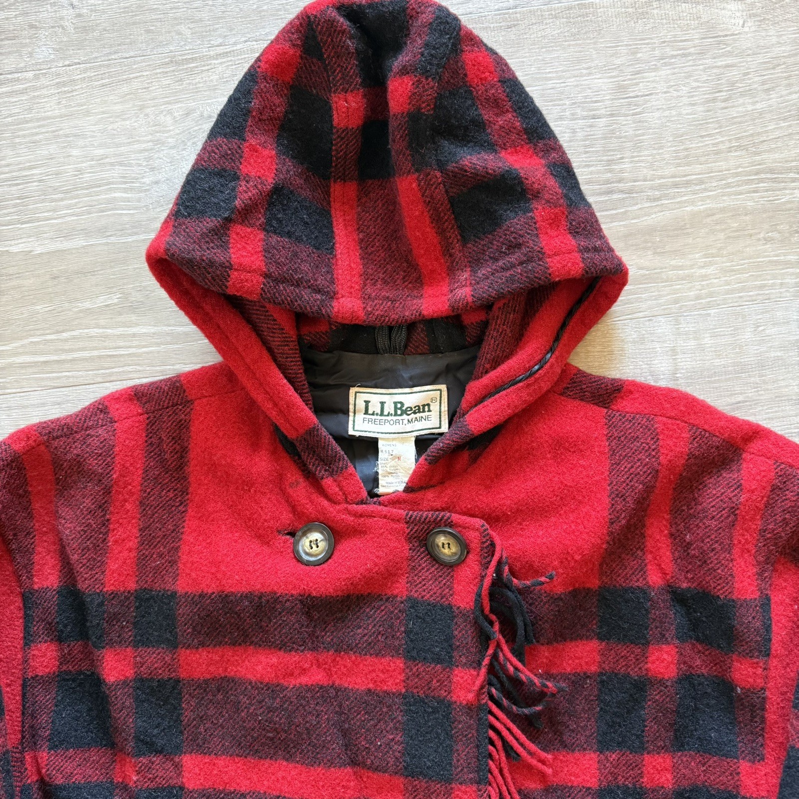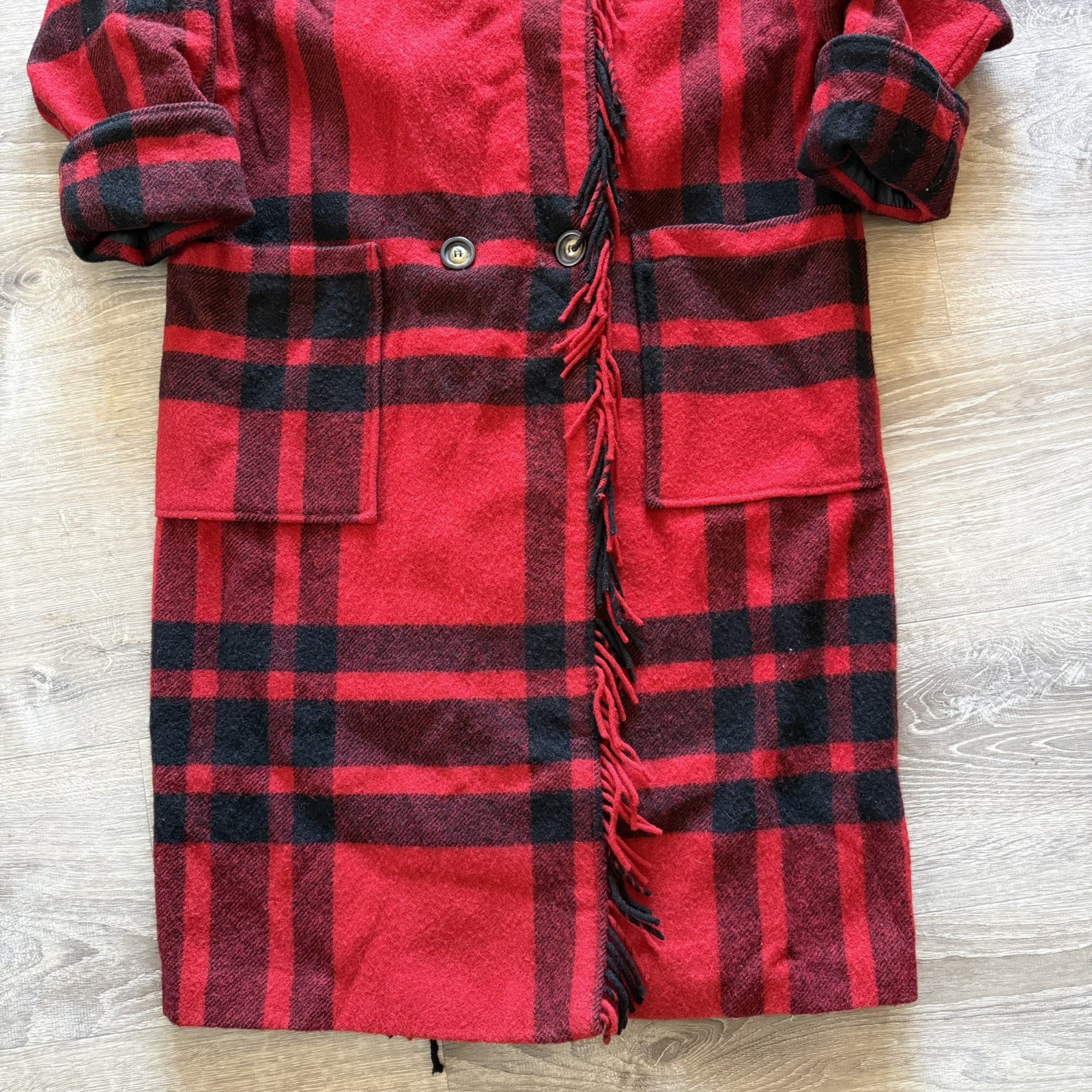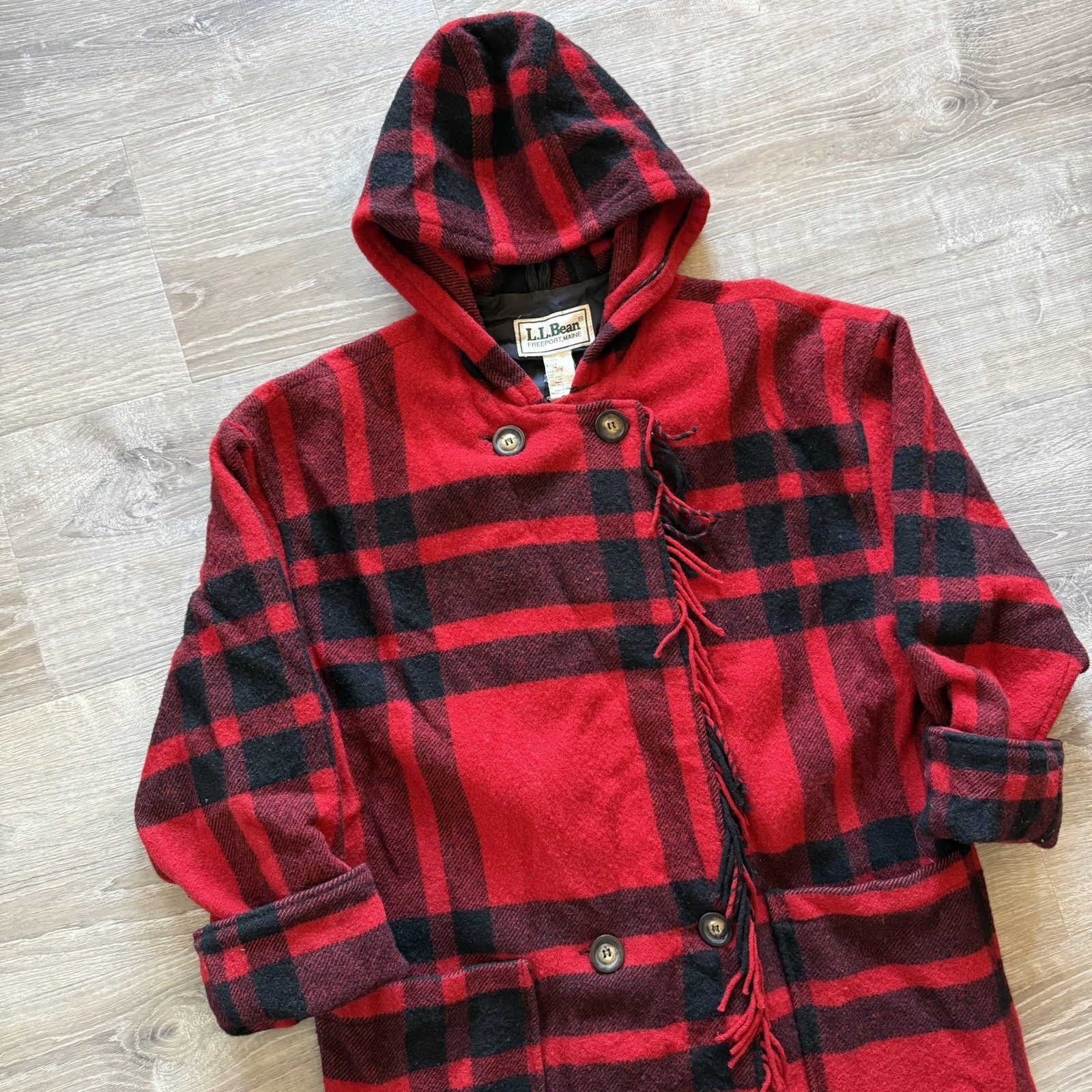 Vintage LL Bean Women's Medium Long Red Wool Plaid Coat with Fringe Made with high-quality wool and featuring a classic plaid pattern, this coat exudes a timeless rustic charm. The long length and long sleeves provide ample warmth during the colder seasons, while the double button closures and lined interior ensure a comfortable fit. With accents of fringe giving it a unique touch, this overcoat is a true statement piece that combines classic American style with a touch of vintage flair. Made in the USA by the reputable brand L.L. Bean, this coat is a must-have for any vintage lovers wardrobe.