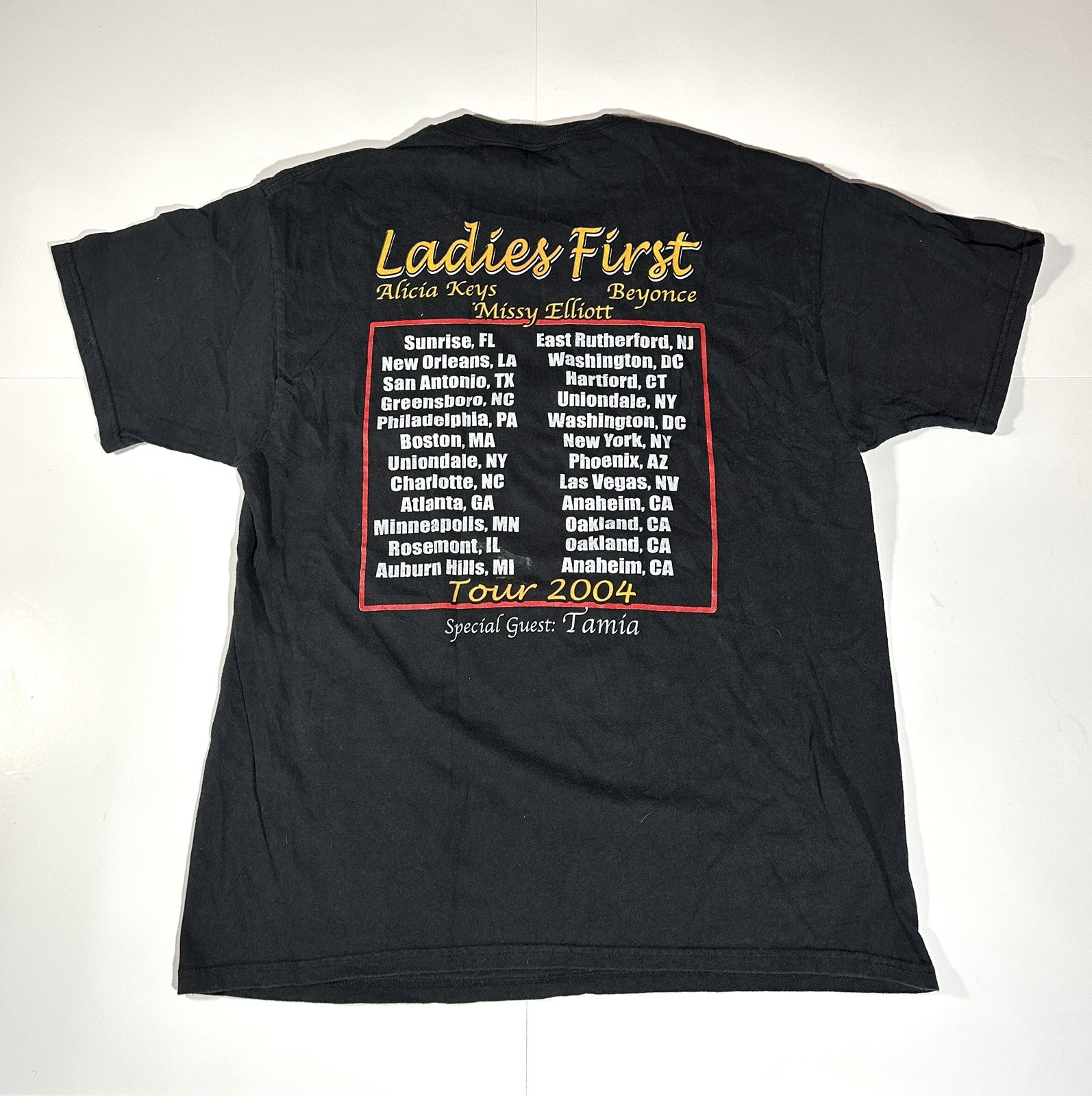 Vintage Ladies First Tour Beyonce Alicia Keys Elliot Black T Shirt Large Rap Y2K Very decent - to - pretty good condition overall - for vintage Y2K hip hop tee - see ALL photos very closely See photos for measurements Shirt has moderate wear/tear overall throughout - some discoloration/fade both sides - has some light little marks bottom right side front side of tee - see ALL photos very closely for condition of the shirt Will ship with care