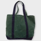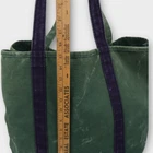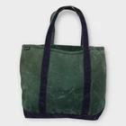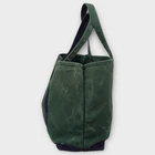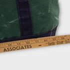 This Vintage Lands' End Canvas Boat Bag Tote is an extra large rectangular tote featuring a distressed finish in navy blue and green colors. It has double green handles and is ideal for travel, casual outings, or workwear. The bag includes pockets for organization and comes with key chain accessories. Made of canvas and cotton, this tote exudes a 90s American outdoor theme and is perfect for those who appreciate vintage style and functionality in their accessories. Condition: No Noticeable Flaws All items are second hand, many being vintage and may have small imperfections. Anything major will be noted.