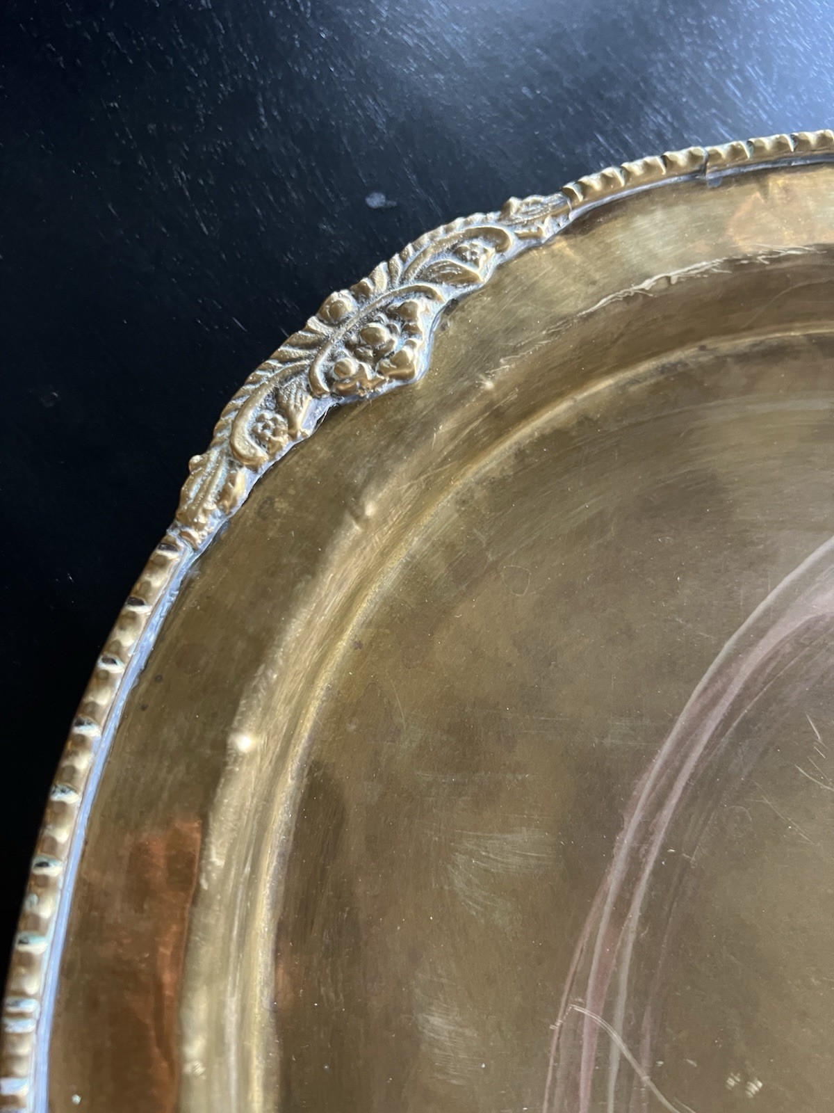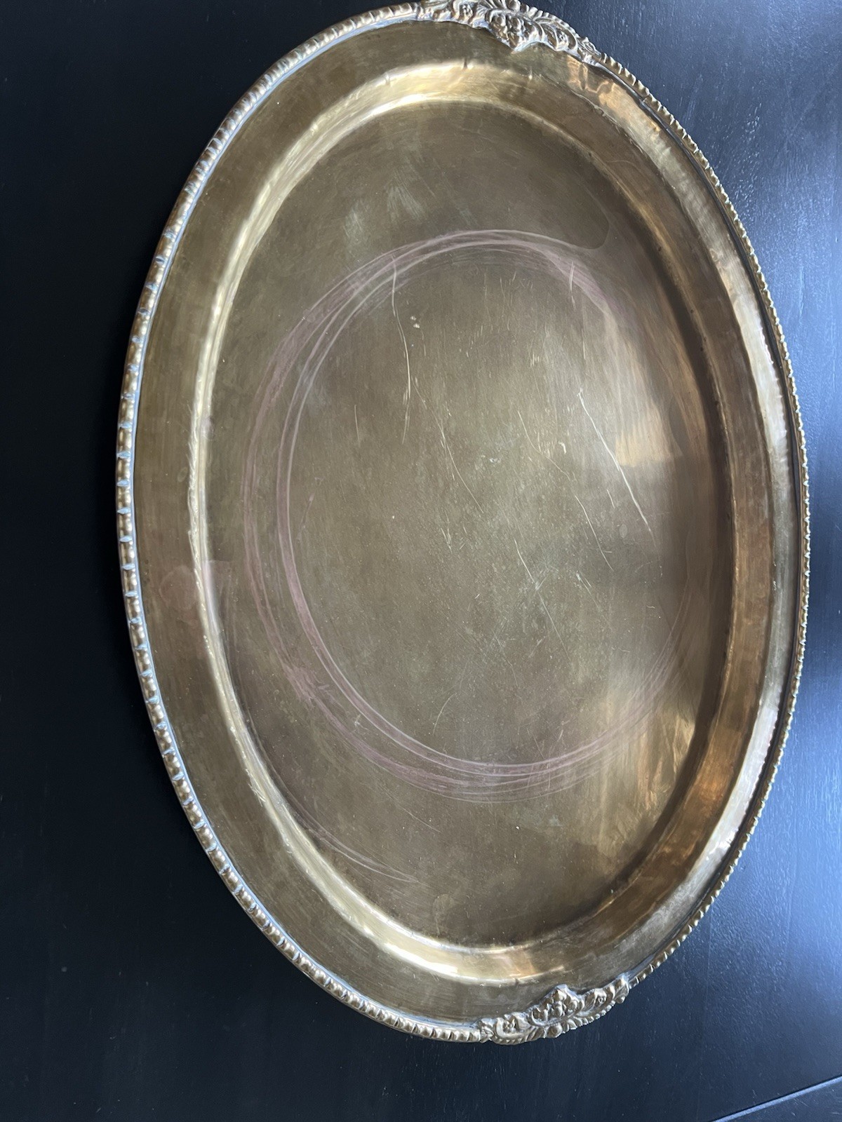 This vintage large brass tray is handmade, adding a unique touch to its design. The brass material gives it a classic and timeless look, perfect for collectors or those seeking a statement piece for their home decor. With its spacious size, this tray is not only functional for serving drinks or holding items, but also serves as a decorative piece that adds character and charm to any room.