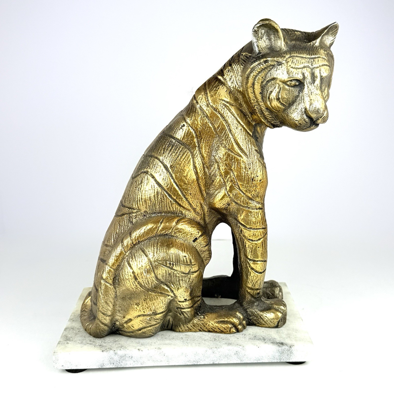 This stunning vintage tiger statue is a true showstopper! The intricate gold detailing and marble base give it a luxurious, antique charm. At over 5 lbs, it feels solid and high-qualityβperfect as a bookend, doorstop, or statement decor piece. The handcrafted Indian artistry makes it unique, with a majestic tiger pose that adds elegance to any space. Though it has slight wear and one missing foam foot, the character only enhances its vintage appeal. A must-have for collectors or anyone who loves bold, exotic decor!