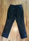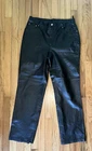 Vintage black leather pants for women in size 14 from the brand Newport News. These actually fit like a 14 worn snug or current sizing 12. Flat front, high rise, and straight leg style with a measured 32-32.5 inch at natural waist and 30-inch inseam. The pants are fully lined. Very nice hardware. Silver metal button closure. Excellent zipper. 5 pocket. Perfect for steam punk, bikers, rock stars, bad girls, good girls and everyone in between.