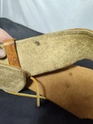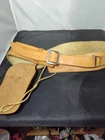 This vintage leather Western hand-tooled gun belt holster is perfect for right-handed cowboys who prefer a horse steer. It's compatible with a variety of guns including Ruger, Remington, and Heritage models in .45 Colt, .22 Magnum, and .44 Magnum calibers. The holster is designed for a hip carry location and features a 3 o'clock position for easy access. Crafted from high-quality leather, this holster is durable and comfortable to wear during shooting sports and hunting activities. It can accommodate one magazine and is a perfect fit for revolvers and pistols. This holster is an excellent addition to your collection, and it's sure to impress your friends and family. It holds 12 extra bullets in the side aswell. See photos before purchase please as there are some discolorations in the leather.
