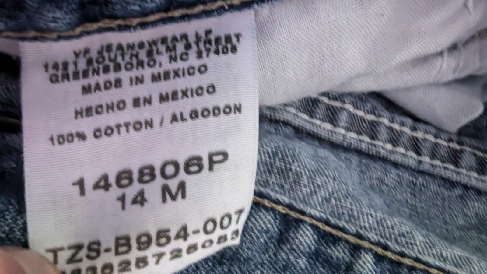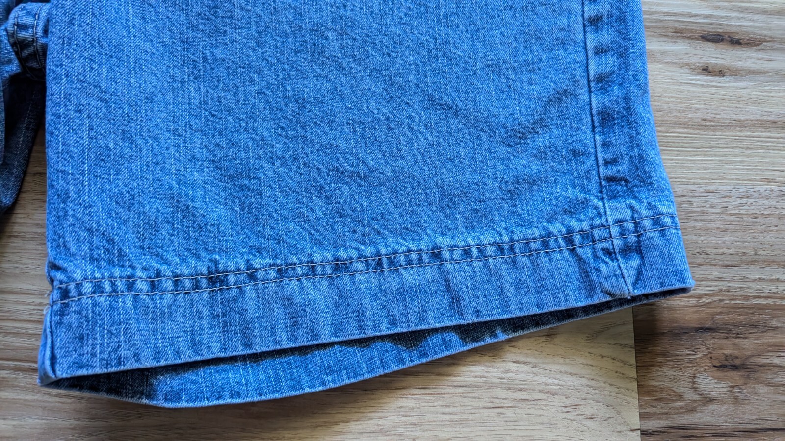 Tag size 14M. Laid flat, the waist measures approx 32 inches & inseam is about 7.5 inches. Medium wash! A few loose threads & minor fading from wash wear throughout. Nice condition!