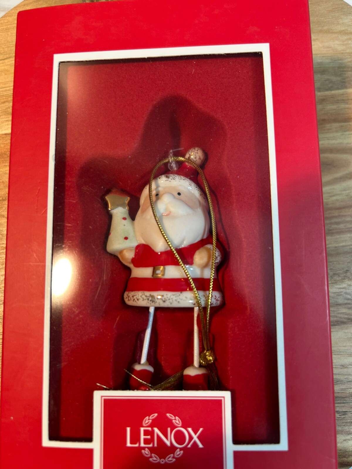 The product is a retired Lenox Christmas ornament featuring a 3.5-inch porcelain Santa Claus figure known as "SANTA's CHIME." The ornament is designed in a contemporary style with a red and white color scheme, suitable for hanging decoration during the holiday season. It is part of the Lenox SANTA's CHIME Christmas Ornament collection and includes a bell for added decorative appeal. This ornament is artist designed and made in China, making it a unique and festive addition to any Christmas decor.