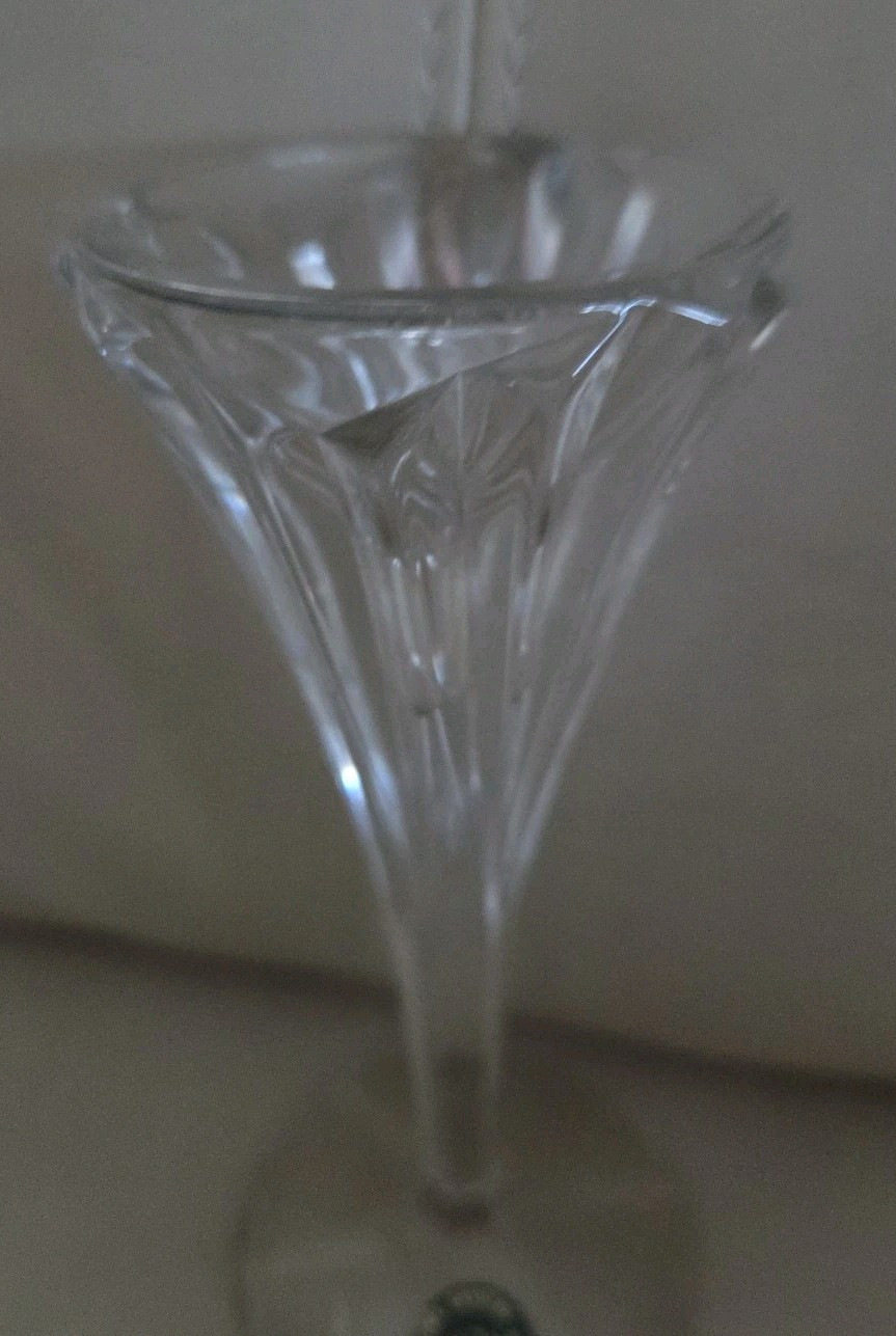 This vintage Lenox crystal candle vase boasts a beautiful scallop edge and asymmetrical shape, making it a unique addition to any collection. Hand blown in Germany, this clear crystal vase is perfect for all occasions and features a solid pattern with a British style. The vase measures 9.5 inches in length and 9 inches in height, with a width of 3 inches at the top. The Lenox crystal vase is an original piece from the 1980s and is perfect for collectors of decorative collectibles. The vase is made of high-quality crystal and is a great example of handcrafted art. This vase is perfect for displaying candles or flowers and will add a touch of elegance to any room.