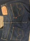 This pair of Levi's 501 jeans is a vintage piece with a riveted 36 waist and 30 length. Made of dark-washed cotton denim, these jeans feature a button closure and straight leg style. The waist size is 36 inches and the inseam is 30 inches. The jeans are part of the Levi's 501 series and have a mid-rise of 10-12 inches. The jeans are perfect for men who want a classic and timeless look. They are not handmade and are not personalized. The Levi's brand is known for its quality and durability, making these jeans a great addition to any wardrobe. The jeans are made in the United States and have a solid pattern with a blue color.