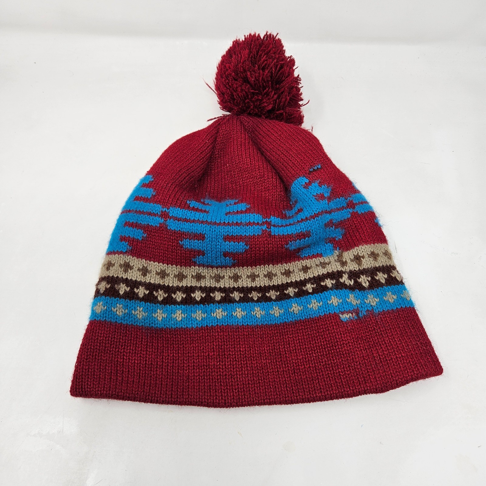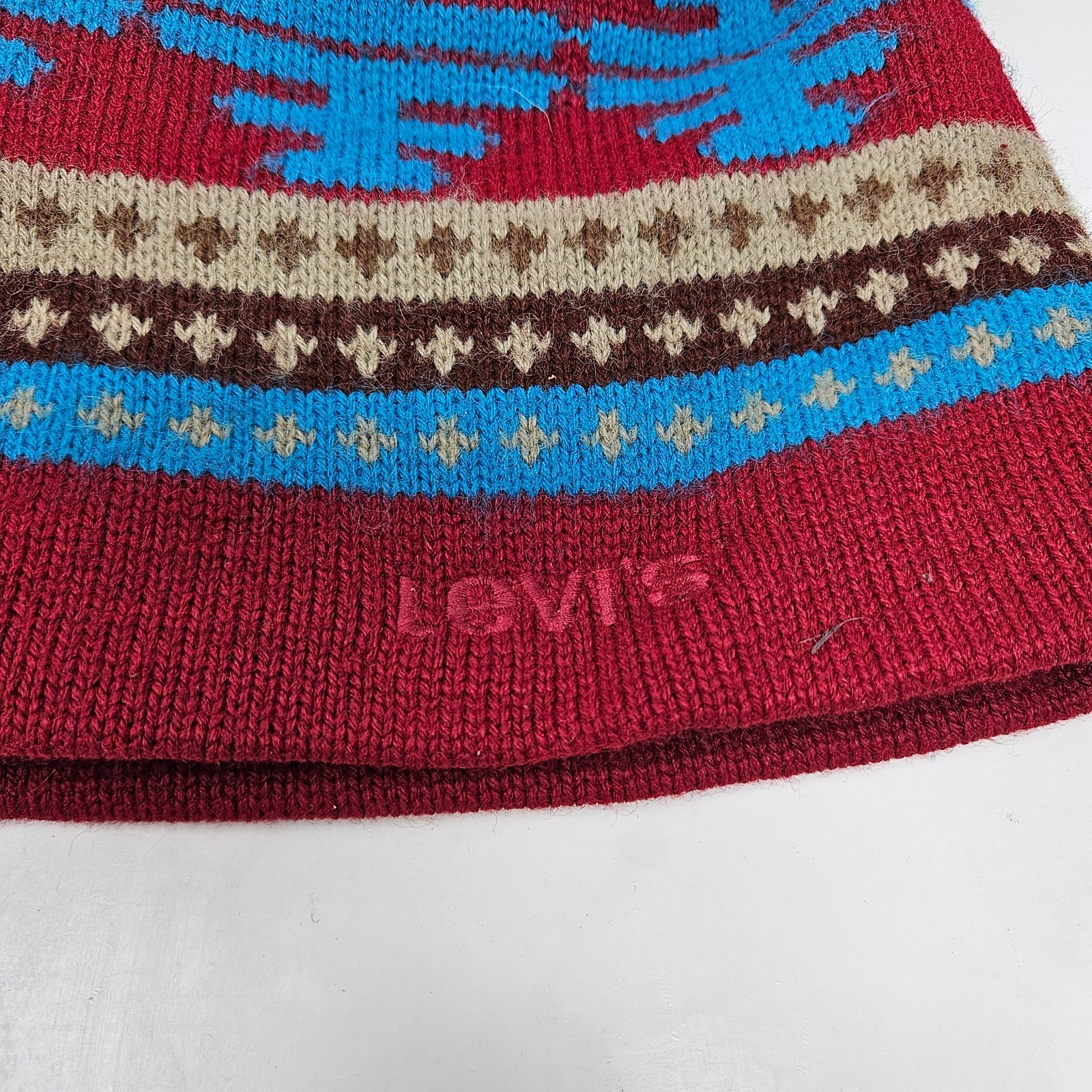 This Vintage Levi’s Beanie Hat is a stylish and versatile accessory for both men and women. Made from a blend of polyester, wool, and acrylic, this knit hat features a geometric pattern in burgundy, tan, and blue. The pom pom detail adds a playful touch to the classic beanie style, perfect for casual winter occasions. With a size M/L, this lightweight hat is a must-have for those looking for a vintage piece from a trusted brand like Levi's.