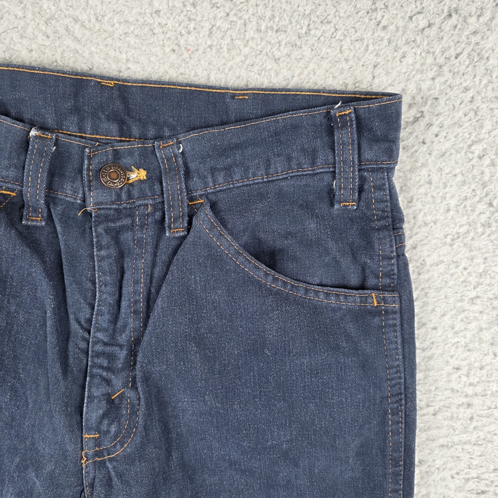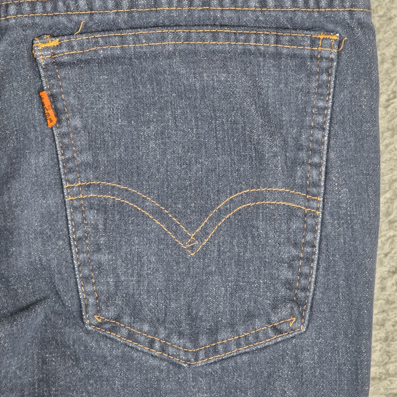 Vintage 1970s Levis orange tab denim jeans in a bell bottom flare cut. Classic orange tab era denim with stamped interior size tag and late 70s style construction details. • Orange tab branding • Bell bottom flare leg • Blue denim wash • Size 28x32 Actual Fit • Cotton denim construction • 1970s orange tab era production Condition: Light general wear consistent with age, no holes or stains observed